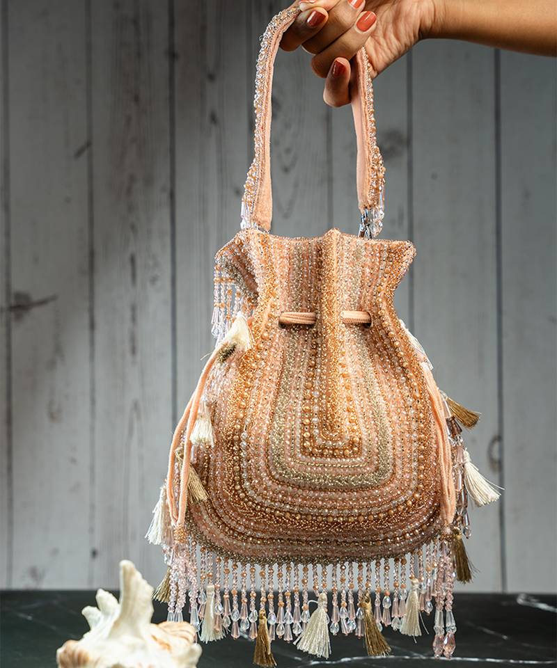| Product Description | The Baraq Potli Is A Stunning Blend Of Elegance And Craftsmanship, Featuring Lustrous Beads And Intricate Work In A Pink And Gold Palette. Finished With Delicate Tassels, It’s The Perfect Accessory For Weddings, Festive Events, Or Evening Soirées.