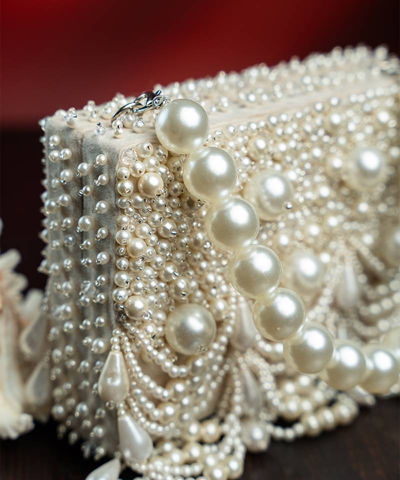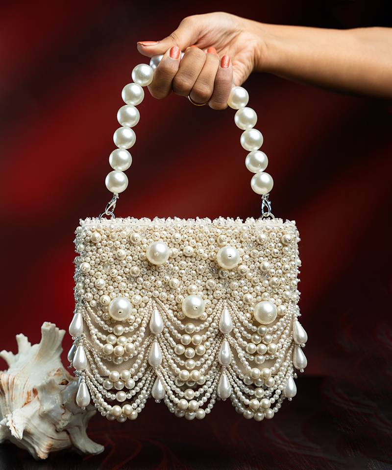 An Incredible Off White Box Clutch Decorated With Pearl Scallops N Tassels All Over Making It A Convenient And Fashionable Addition To Any Outfit.