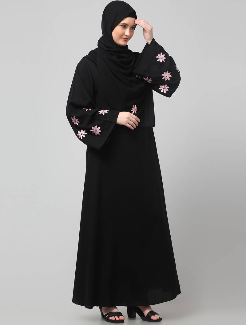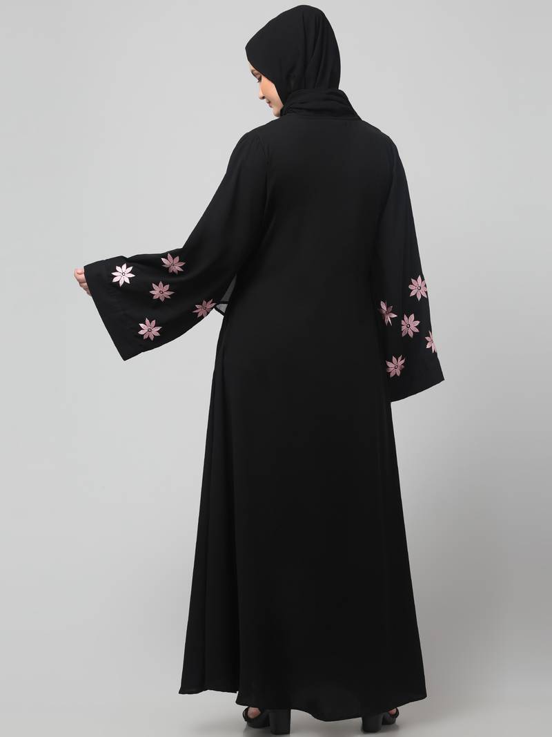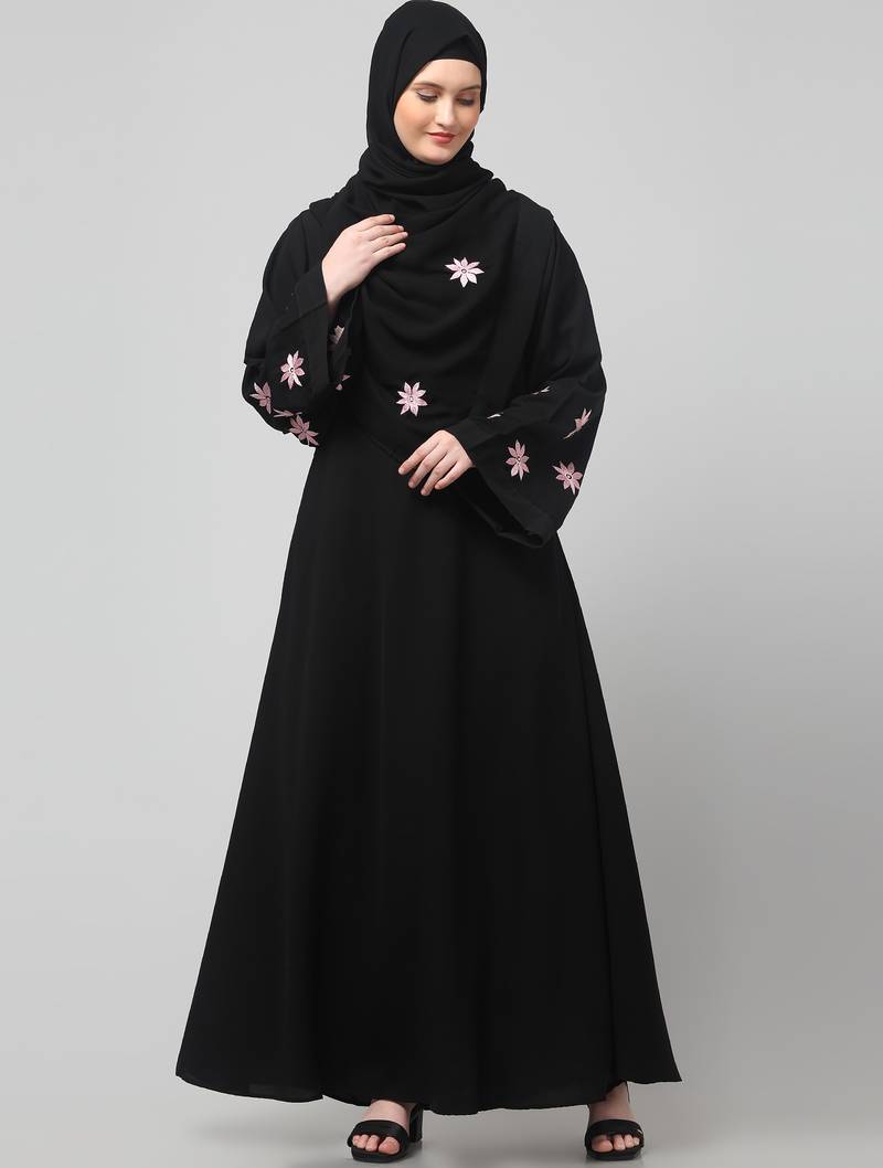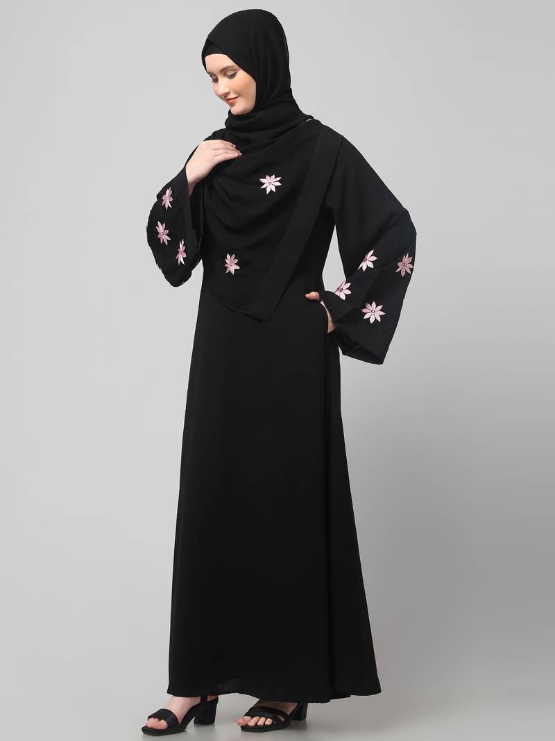 Flowers embboidery at sleeve and hijab a line flare at bottom abaya with hijab