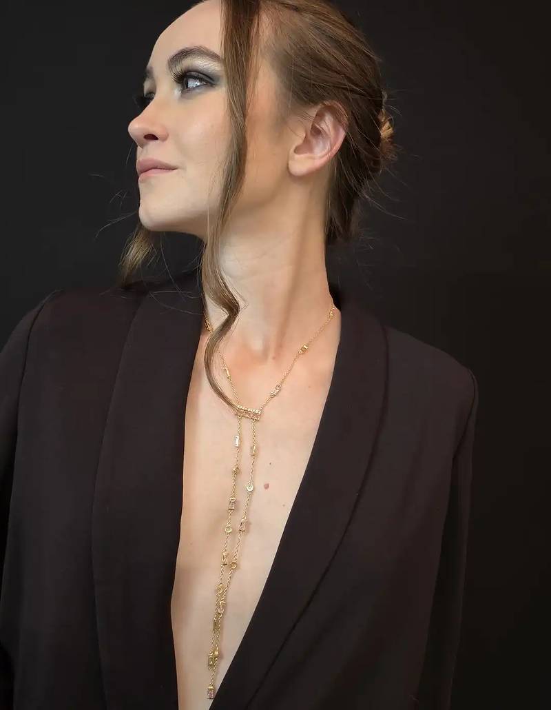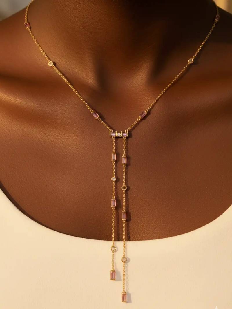 | Product Description | Delicate Gold Tone Lariat Necklace With Multicolor Baguette Stones — Minimal, Modern, And Effortlessly Elegant. |