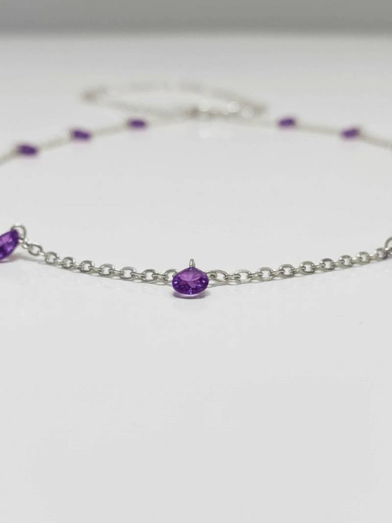 | Product Description | Crafted In Pure 925 Sterling Silver With Faceted Violet Glass Stones Delicately Linked On A Fine Adjustable Chain. |