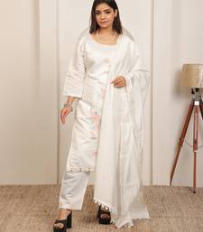 White embroidery work cotton blend kurta trousers with dupatta. stitched
