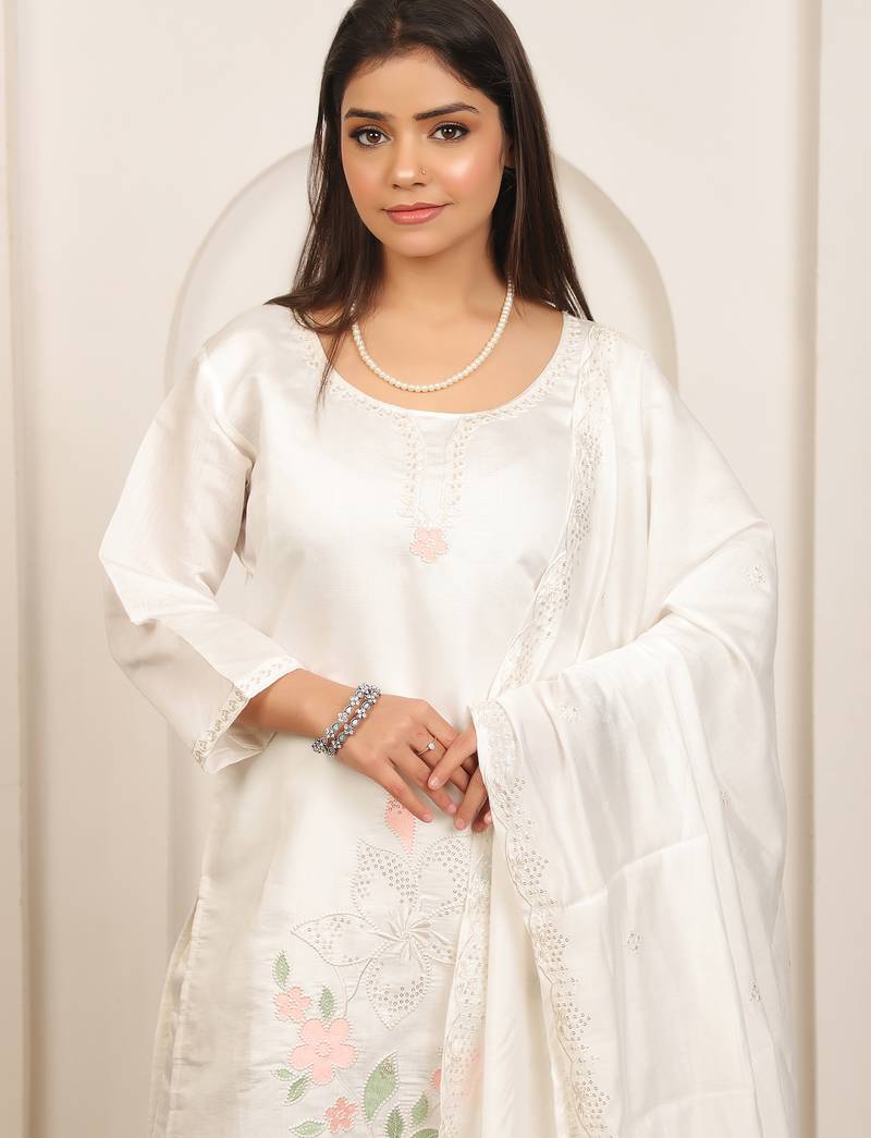 | Product Name | White Embroidery Work Cotton Blend Kurta Trousers With Dupatta. | |
