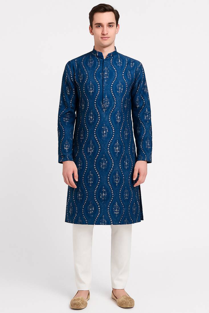 | Product Description | Step Out In Style With This Exquisite Blue Silk Sequins Embroidery Straight Men's Kurta Pyjama Set. Crafted From Luxurious Deep Blue Silk, The Kurta Features An Eye Catching, All Over Embroidered Design Adorned With Shimmering Sequins, Lending A Regal And Festive Air. The Intricate Work Is Beautifully Contrasted By The Kurta's Straight Silhouette And Elegant Mandarin Collar. Paired With Classic White Pyjama Bottoms, This Ensemble Strikes The Perfect Balance Between Traditional Elegance And Contemporary Style, Making It An Ideal Choice For Weddings, Parties, Or Any Celebratory Event. |