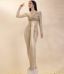 | Product Description | This Striking Outfit Is A Modern Statement Piece, Featuring A Figure Hugging Gold Lycra Gown That Is Expertly Draped To Create A Fluid, Luxurious Silhouette. The Contemporary Look Is Elevated By A Unique, Sculptural Detail: A Matching Resin Bust Plate Is Seamlessly Incorporated, Offering A High Fashion, Armored Aesthetic That Blends Fabric Softness With Structural Art. It's A Powerful Choice For A Red Carpet Event