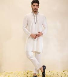 | Product Description | This Refined Ivory Kurta Features Intricate Hand Embroidery Detailing On The Collar And Around The Placket, Adding A Touch Of Elegance To Its Minimalist Design. Paired With Matching Narrow Pants, This Ensemble Offers A Perfect Blend Of Tradition And Sophistication, Ideal For Festive Gatherings Or Special Occasions.
