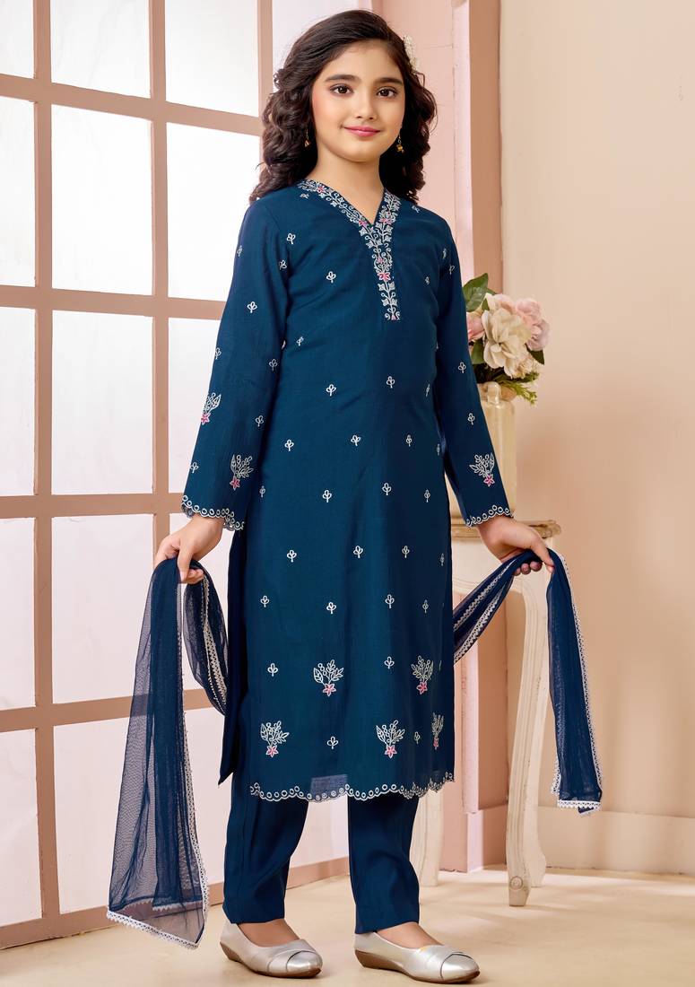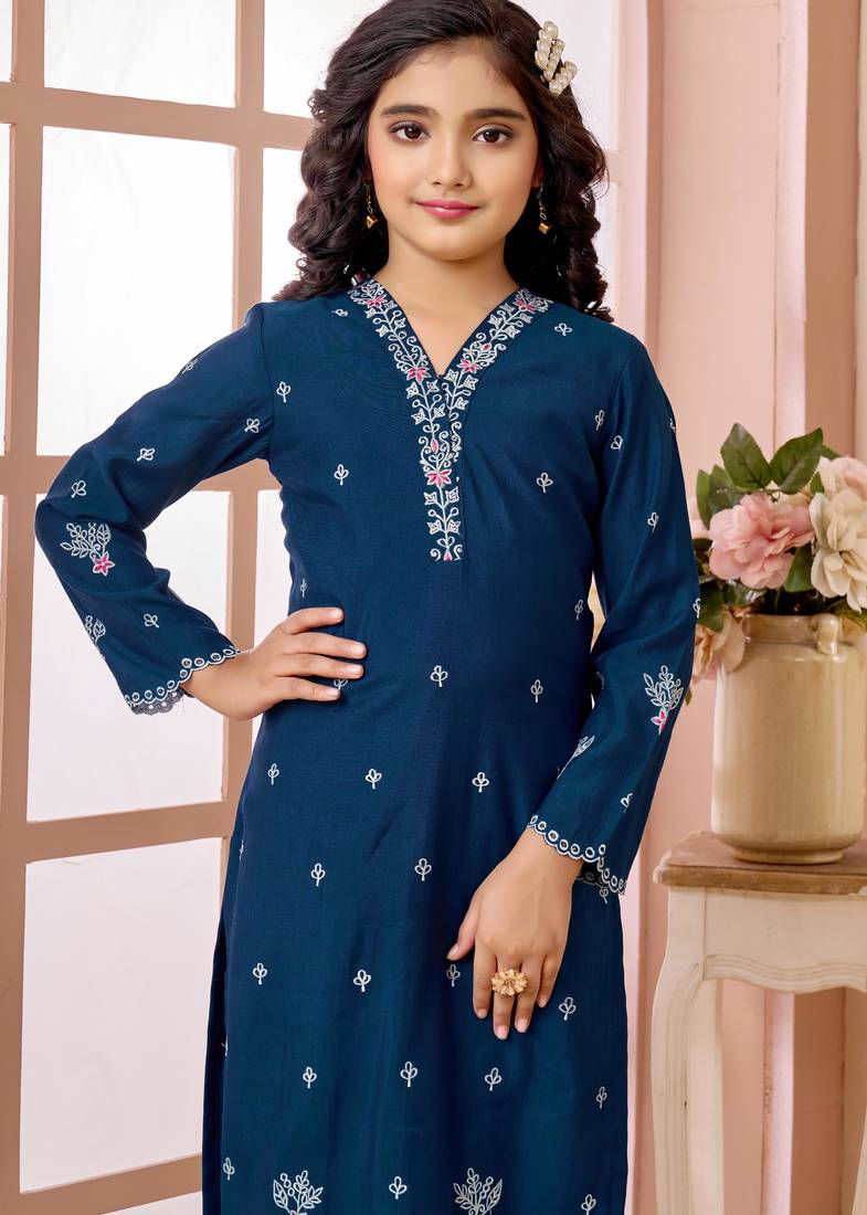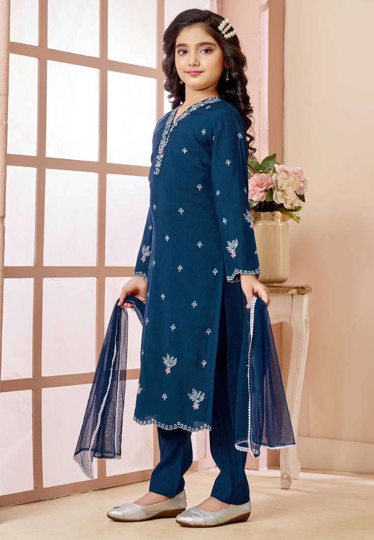 | Product Name | Blue Resham Embroidery Art Silk Straight Cut Kids Salwar Suits | |
