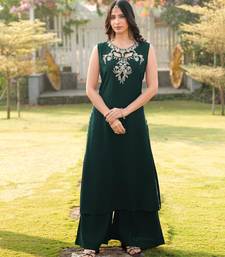 | Product Description | Sleeveless Dark Green Art Silk Kurta With Intricate Silver/Gold Embroidery Around The Front And Back Neckline With Cut Out Detailing. |