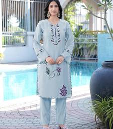 Light-blue embroidered art silk straight cut kurta pants set