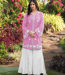 | Product Description | Light Pink Modal Satin Kurta With White Floral Embroidery On The Sleeves And Hem, And White Lace Trim Along The Neckline And Front Opening. Paired With Off White Kalidar Palazzo Pants |