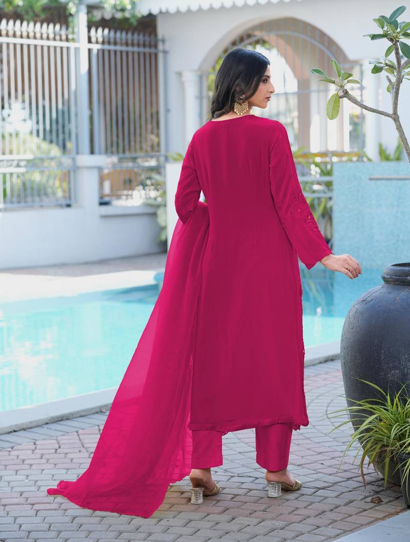 | Product Name | Magenta Embroidered Art Silk Stitched Straight Cut Kurta Pants Dupatta Readymade Suits | |