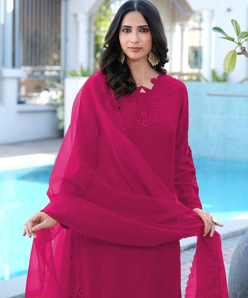 | Product Description | Magenta Art Silk Kurta With Intricate Cutwork Embroidery On The Neckline, Sleeves, And Hem, And Scalloped Lace Detailing Along The Front Slit. Matching Magenta Pants That Are Straight Cut And Reach The Ankles. Paired With Magenta Dupatta With Embroidered Floral Motifs And Scalloped Edges, Draped Over Left Shoulder. |