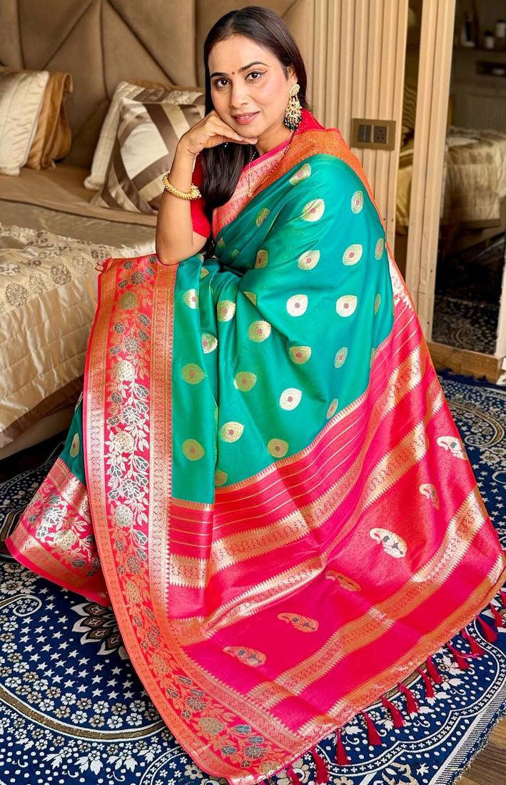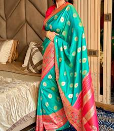 Green color art silk saree with contrast blouse