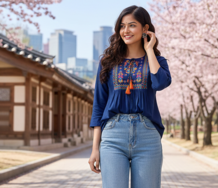 This Vibrant Top Is A Perfect Example Of Ethno Western Fusion, Blending Traditional Indian Craftsmanship With A Contemporary Silhouette. Elevate Your Everyday Style With Our Teal Ember Embroidered Top, A Stunning Tribute To Indian Heritage Reimagined For The Modern Wardrobe. This Burnt Teal Tunic Features Intricate Hand Embroidery Inspired By The Timeless Floral Motifs Of Kashmiri And Phulkari Traditions. Crafted By Skilled Indian Artisans, The Multi Colored Thread Work Creates A Focal Point At The Yoke, Making It A True Piece Of Wearable Art. Shop The Teal Ember Embroidered Tunic—A Masterpiece Of Indian Artisan Embroidery Meets Western Boho Style. Featuring Intricate Floral Thread Work, A Tassel Tie Neck, And A Flattering A Line Fit. Perfect For Casual Outings Or Festive Fusion Looks. Handcrafted. Authentic. Timeless.
