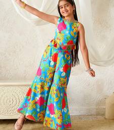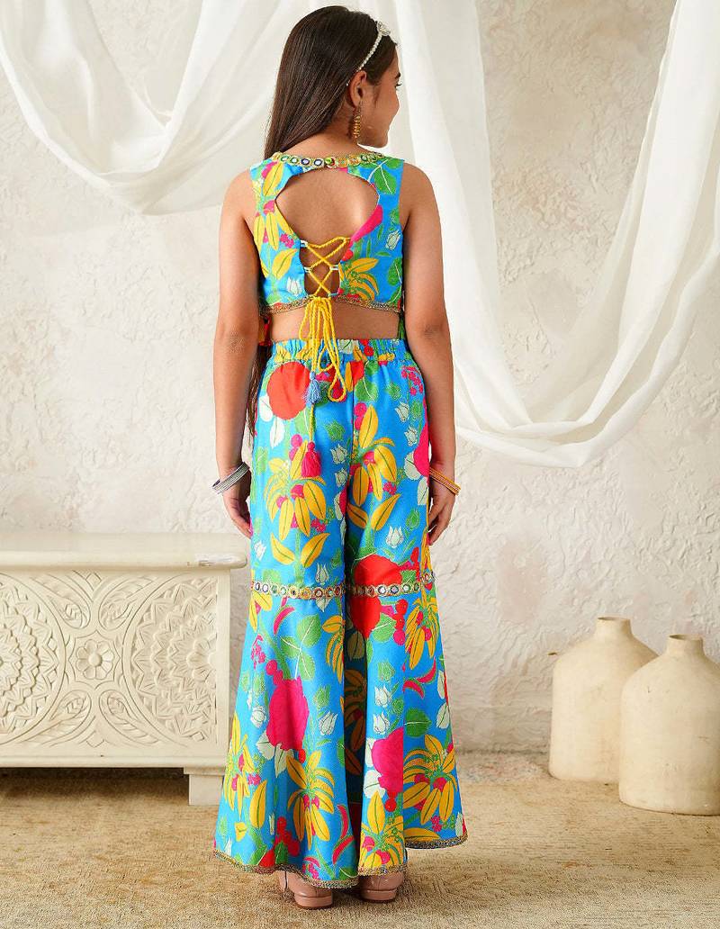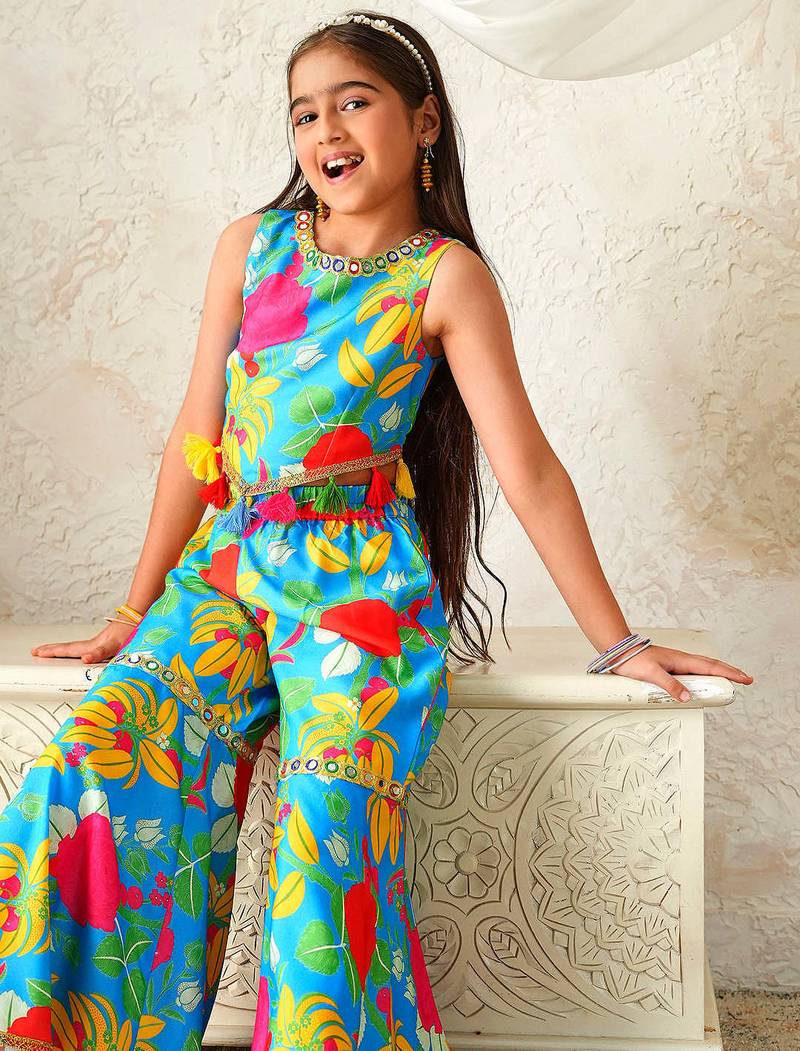 | Product Description | A Bold Mix Of Color And Pattern Defines This Blue Rayon Sharara Set For Girls. The Fabric Has A Smooth, Fluid Fall That Gives The Outfit A Clean, Structured Look Without Feeling Heavy. The Vibrant Floral Design Stands Out Against The Blue Base, Creating A Striking Visual That Feels Lively And Modern. The Cropped Style Top Adds A Contemporary Edge, While Subtle Woven Detailing Enhances The Overall Finish. The Sharara Features A Wide Flare, Giving It A Distinctive Shape That Moves Freely And Adds Volume To The Outfit. Tassel Accents Introduce A Playful Element, Making The Set Feel More Dynamic. Well Suited For Festive Occasions, Birthday Celebrations, Or Wedding Functions, This Outfit Balances Statement Style With Ease. It Can Be Styled Minimally To Let The Print Stand Out Or Paired With Accessories For A More Dressed Up Look. |