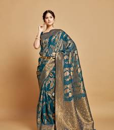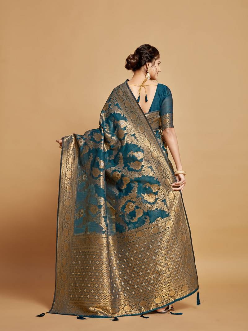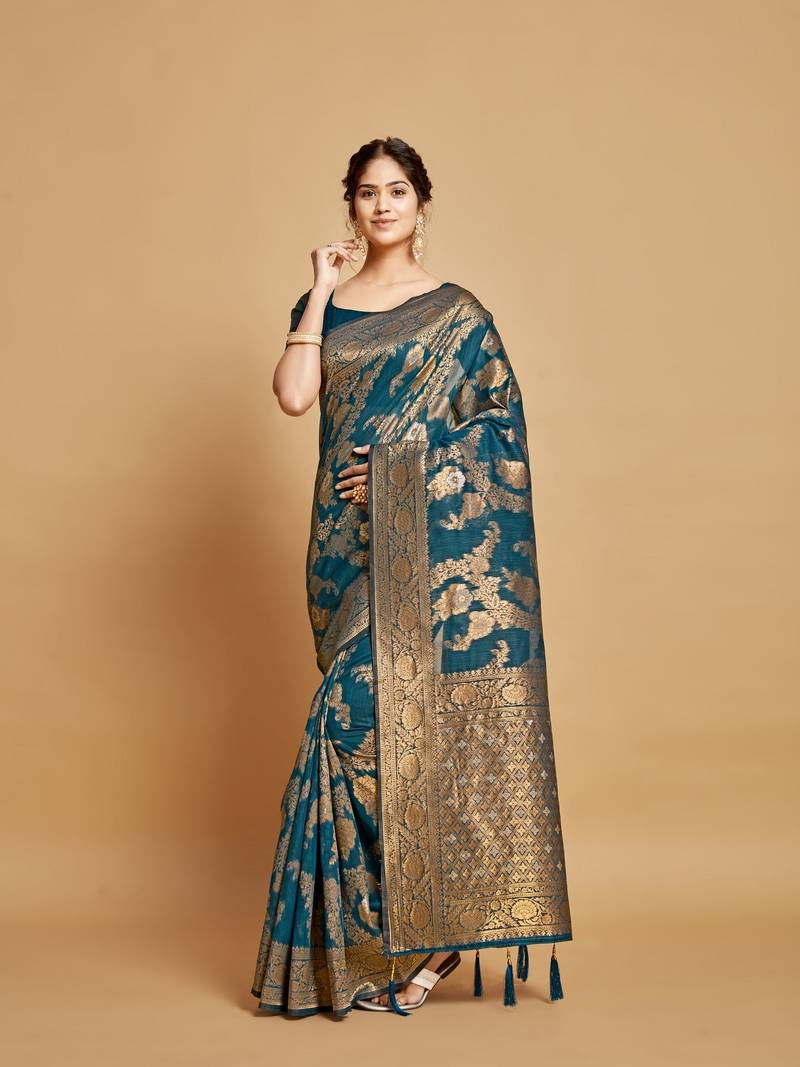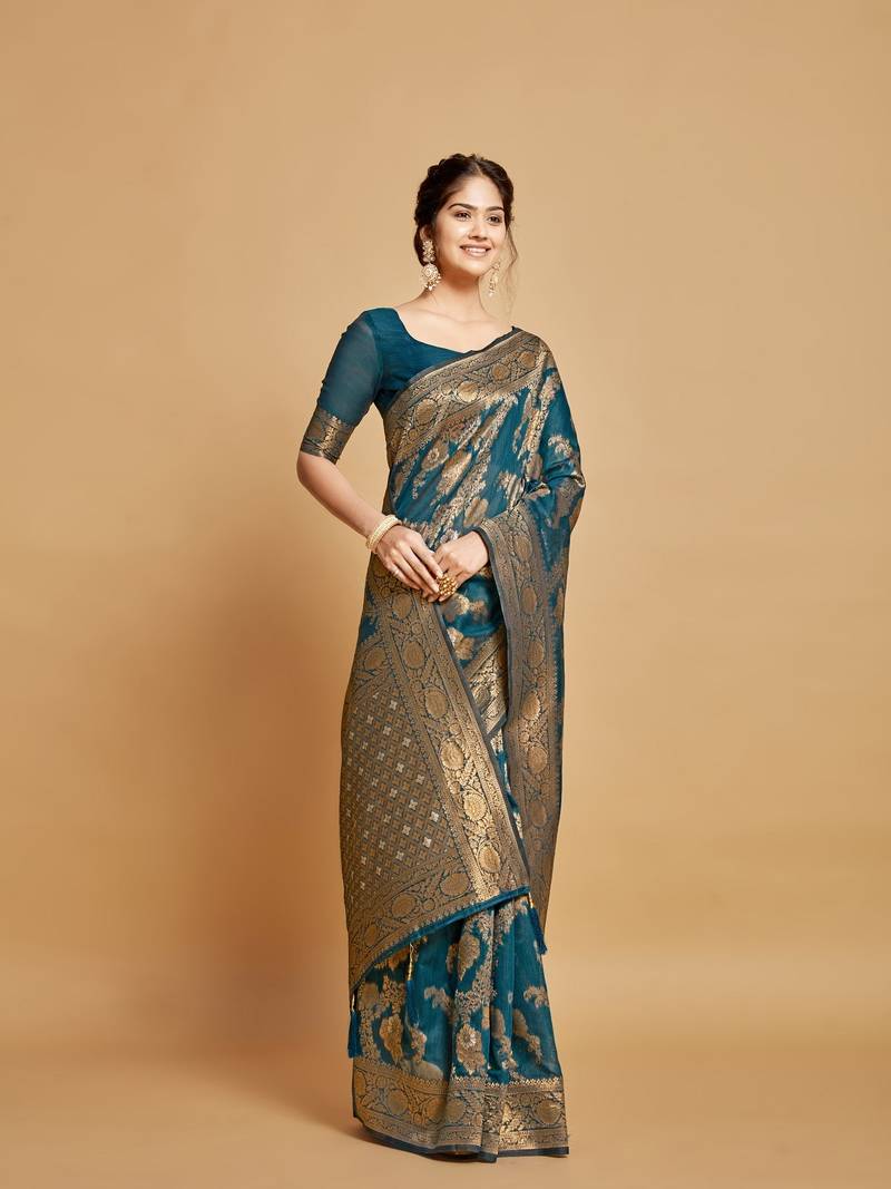 Teal jari weaving linen saree with un stitched blouse