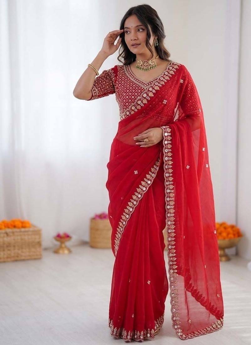 Women red sequence beds work organza silk party wear saree