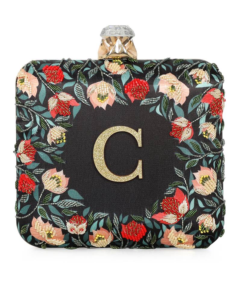| Product Description | Showcases Vibrant Black, Green, And Red Floral Printed Back With Elegant Embroidered Detailing On The Front Panel. Features A Standout Alphabet 'c' Motif For Personalized Expression. Structured Box Silhouette With Click Closure Secures Essentials Stylishly. Comes With A Shoulder Strap For Comfortable Crossbody Or Handheld Carry. A Festive Pick For Events, Gifting, Or Personalized Fashion... |