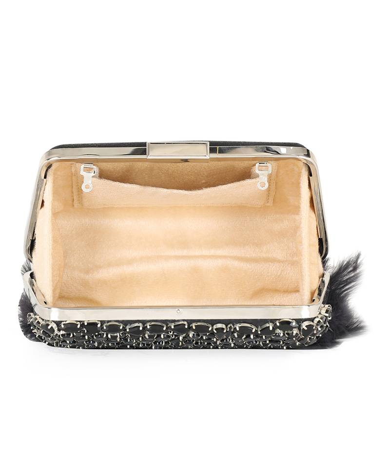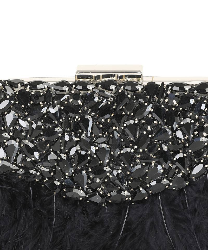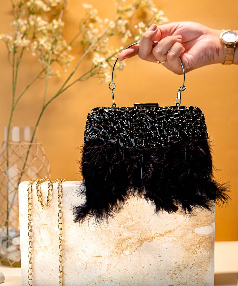 | Product Description | Box Clutch In Rich Black, Embellished With Tonal Feathers And Black Diamonds. Features A Wrist Loop For Secure Handling And Sleek Styling. Click Lock Closure Protects Essentials In The Spacious Main Compartment. Dramatic And Luxurious—Perfect For Evening Glam Or Formal Occasions. Style Note: Pair With Sequin Black Gowns Or Embroidered Sarees To Embrace Its Noir Sophistication. |