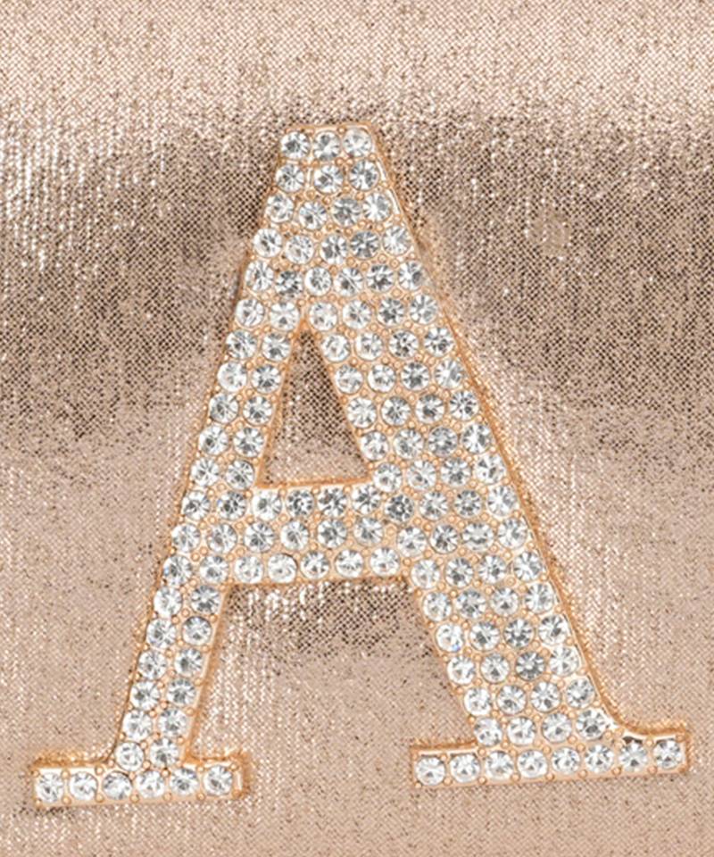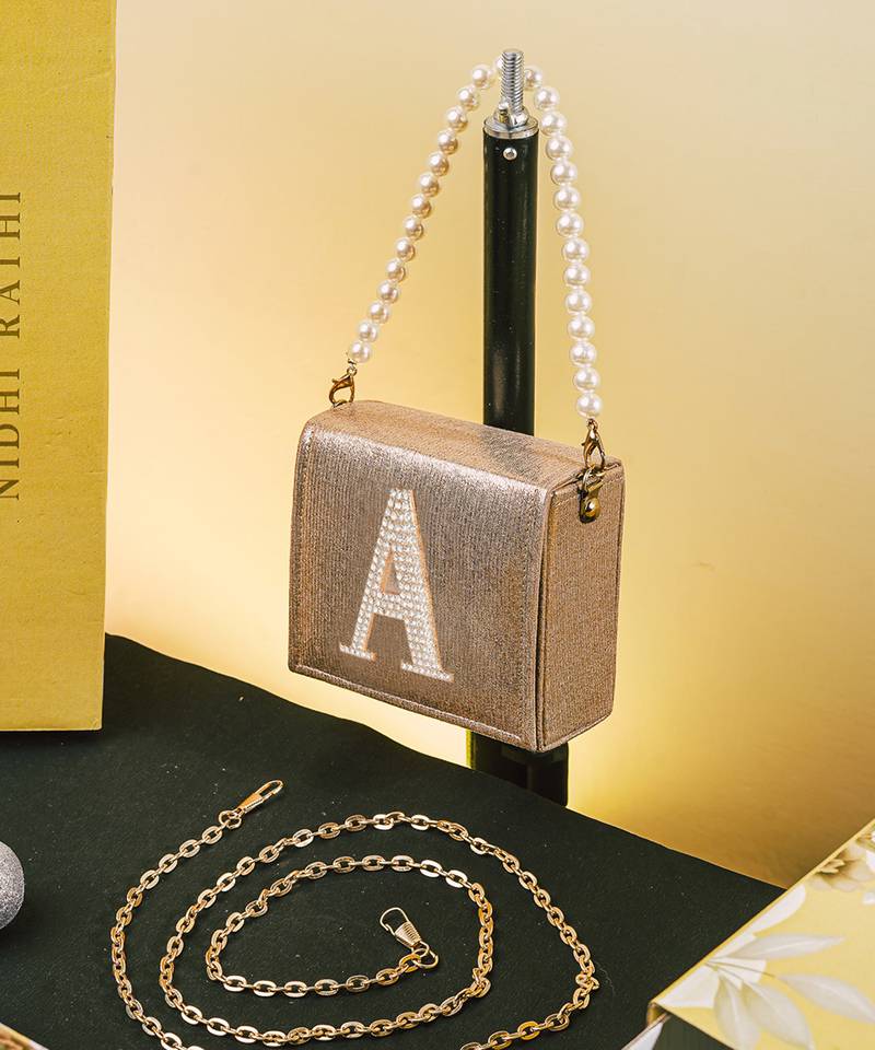 | Product Description | Structured Box Clutch In Gleaming Gold Tone With Diamond Style Embellishments. Features A Bold ‘A’ Alphabet Accent For Personalized Charm. Includes A Detachable Shoulder Strap For Hands Free Styling Flexibility. Button Closure Secures Essentials Within The Roomy Main Compartment. Luxe And Expressive—Perfect For Gifting, Bridal Wear, Or Festive Edits With A Touch Of Identity. |