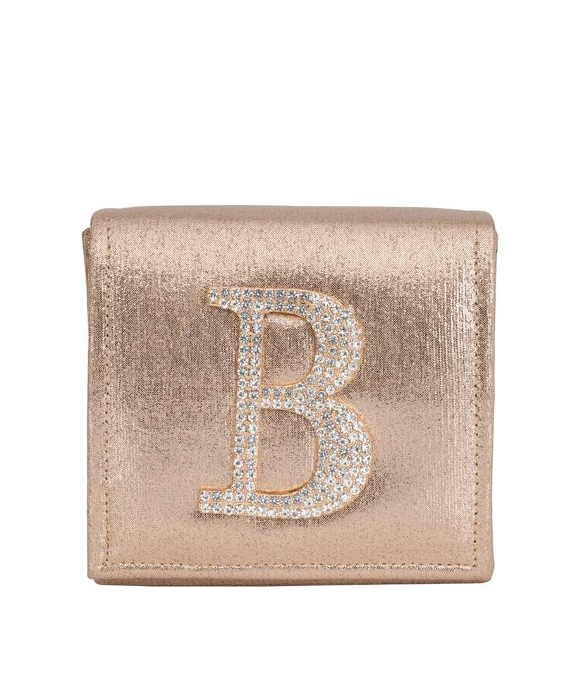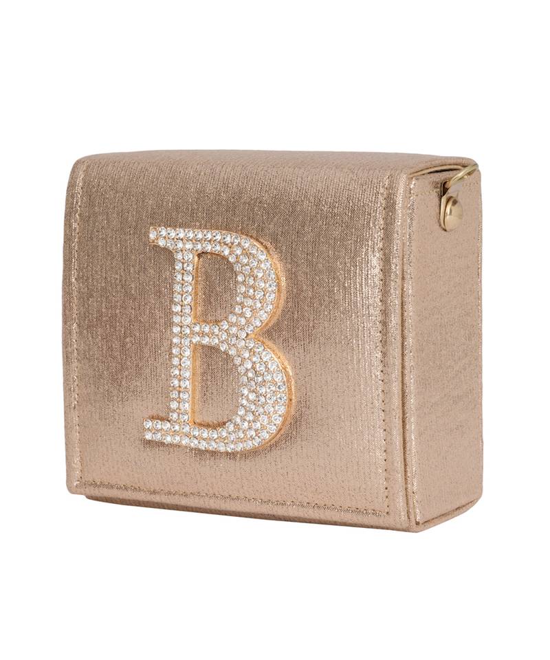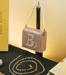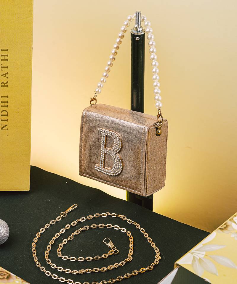 | Product Description | Structured Box Clutch In Gleaming Gold Tone With Diamond Style Embellishments. Features A Bold ‘B’ Alphabet Accent For Personalized Charm. Includes A Detachable Shoulder Strap For Hands Free Styling Flexibility. Button Closure Secures Essentials Within The Roomy Main Compartment. Luxe And Expressive—Perfect For Gifting, Bridal Wear, Or Festive Edits With A Touch Of Identity. |