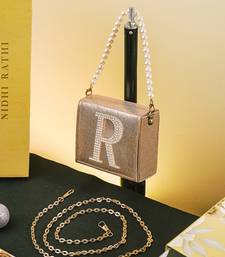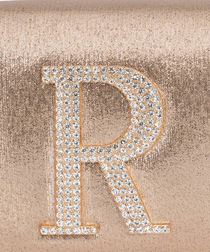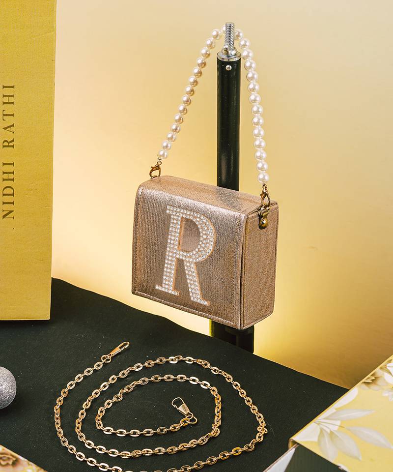 | Product Description | Structured Box Clutch In Gleaming Gold Tone With Diamond Style Embellishments. Features A Bold ‘R’ Alphabet Accent For Personalized Charm. Includes A Detachable Shoulder Strap For Hands Free Styling Flexibility. Button Closure Secures Essentials Within The Roomy Main Compartment. Luxe And Expressive—Perfect For Gifting, Bridal Wear, Or Festive Edits With A Touch Of Identity. |