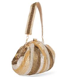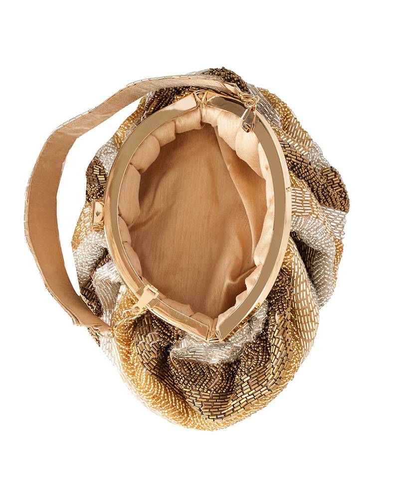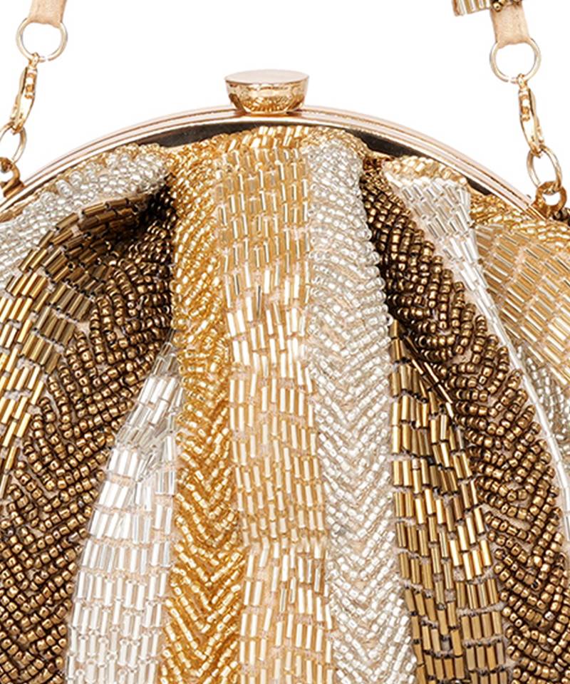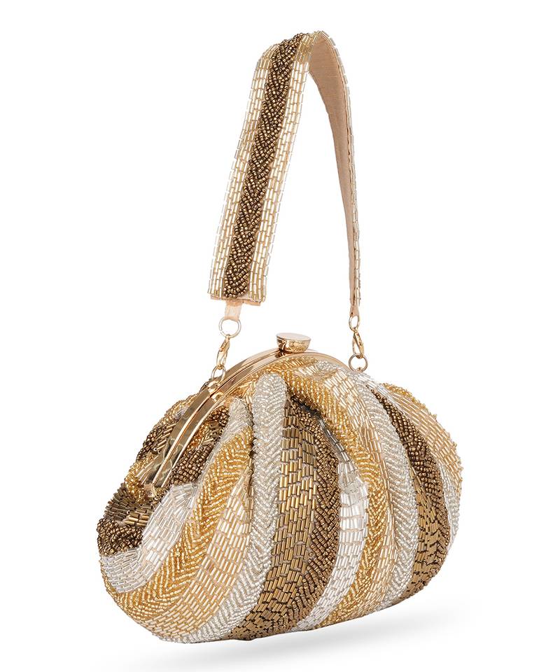 | Product Description | Half Moon Clutch With Eye Catching Stripes In Gold, Silver, And Bronze Embroidery. Features A Twist Lock Closure And A Spacious Single Compartment For Your On The Go Essentials. Wrist Loop Adds A Sleek, Effortless Handling Option. Perfect For Cocktail Nights, Festive Events, Or Glammed Up Brunches. Style Note: Rock It With Neutral Tone Ensembles Or Metallic Maxis For A Shimmering Tri Metal... |