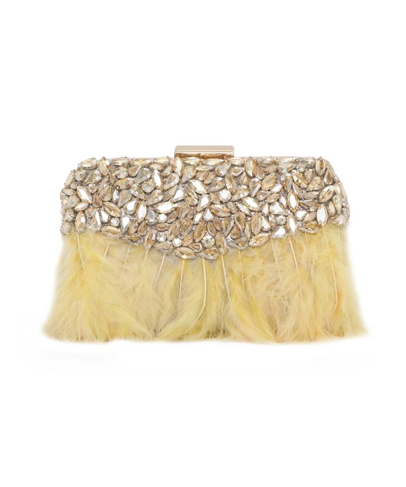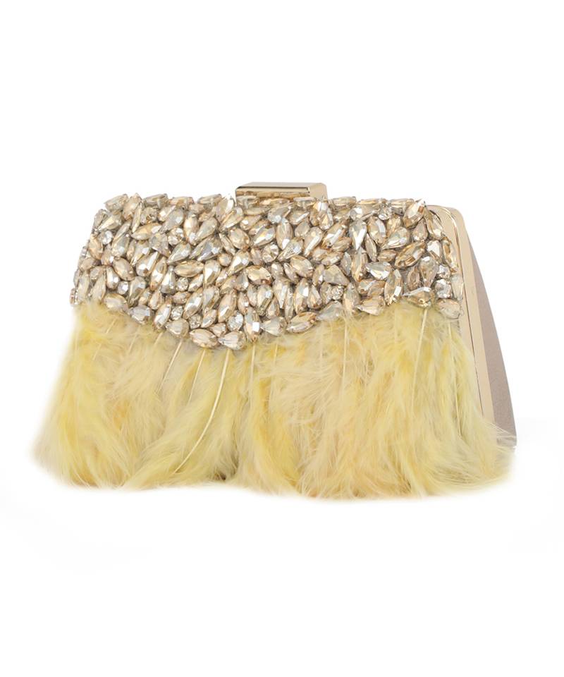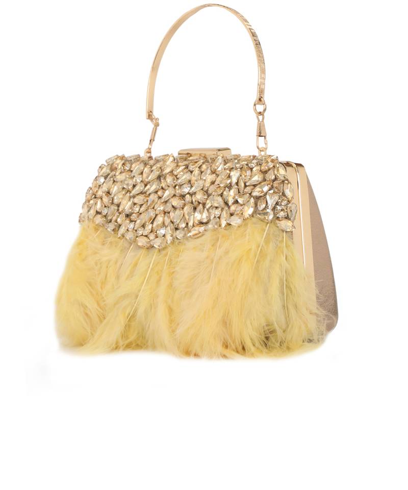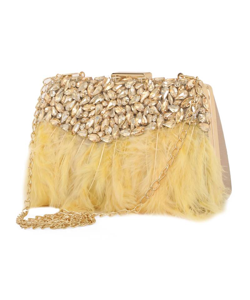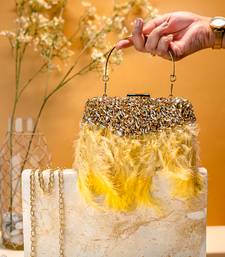 | Product Description | Box Clutch In Shimmering Gold, Embellished With Soft Feathers And Golden Diamonds. Features An Elegant Wrist Loop For Secure And Graceful Carry. Click Lock Closure Safeguards Essentials In The Main Compartment. Opulent And Eye Catching—Perfect For Bridal Wear Or Cocktail Evenings. Style Note: Pair With Champagne Sarees Or Metallic Lehengas For A Golden Hour Glam Effect. |