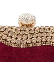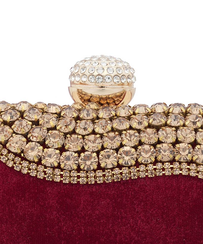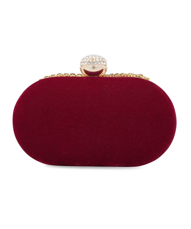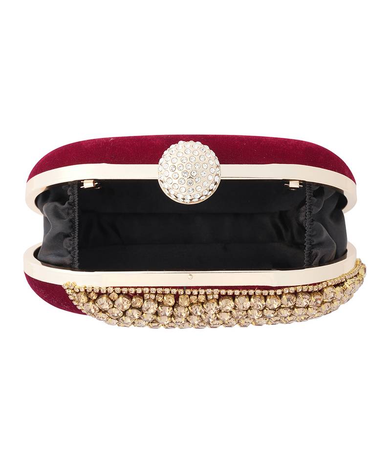 | Product Description | Regal Box Clutch In Rich Maroon Base Adorned With Dazzling Gold Toned Diamond Embellishments. Features A Detachable Shoulder Strap For Seamless Shift Between Handheld And Sling Styling. Twist Lock Closure Opens To A Roomy Main Compartment For Party Essentials. Perfect For Cocktail Evenings, Wedding Receptions, Or Gala Nights. Style Note: Pair It With Zari Woven Sarees Or Structured Velvet Sets... |
