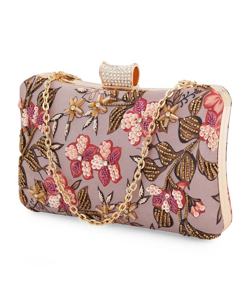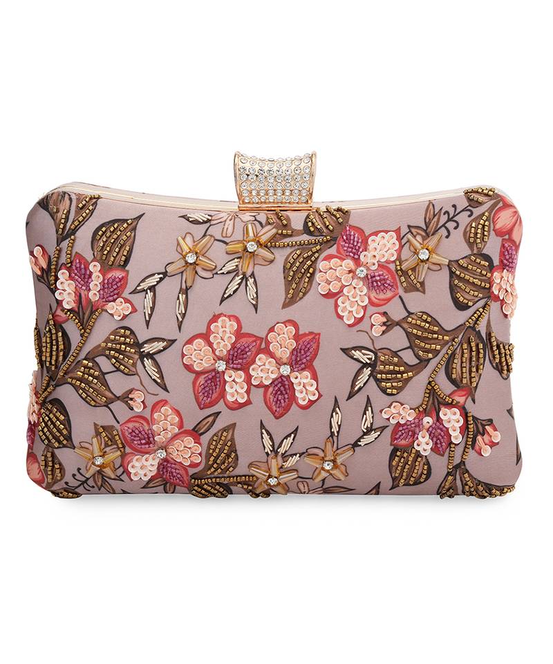 | Product Description | Elegant Box Clutch In Soft Pink With Delicate Floral Embroidery. Includes A Detachable Shoulder Strap For Versatile Styling. Twist Lock Closure Opens To One Spacious Compartment For Essentials. Perfect Pick For Festive Occasions, Daytime Events, Or Gifting. Style Note: Pair With Lace Trimmed Lehengas Or Pastel Shararas For A Dreamy, Feminine Touch. |