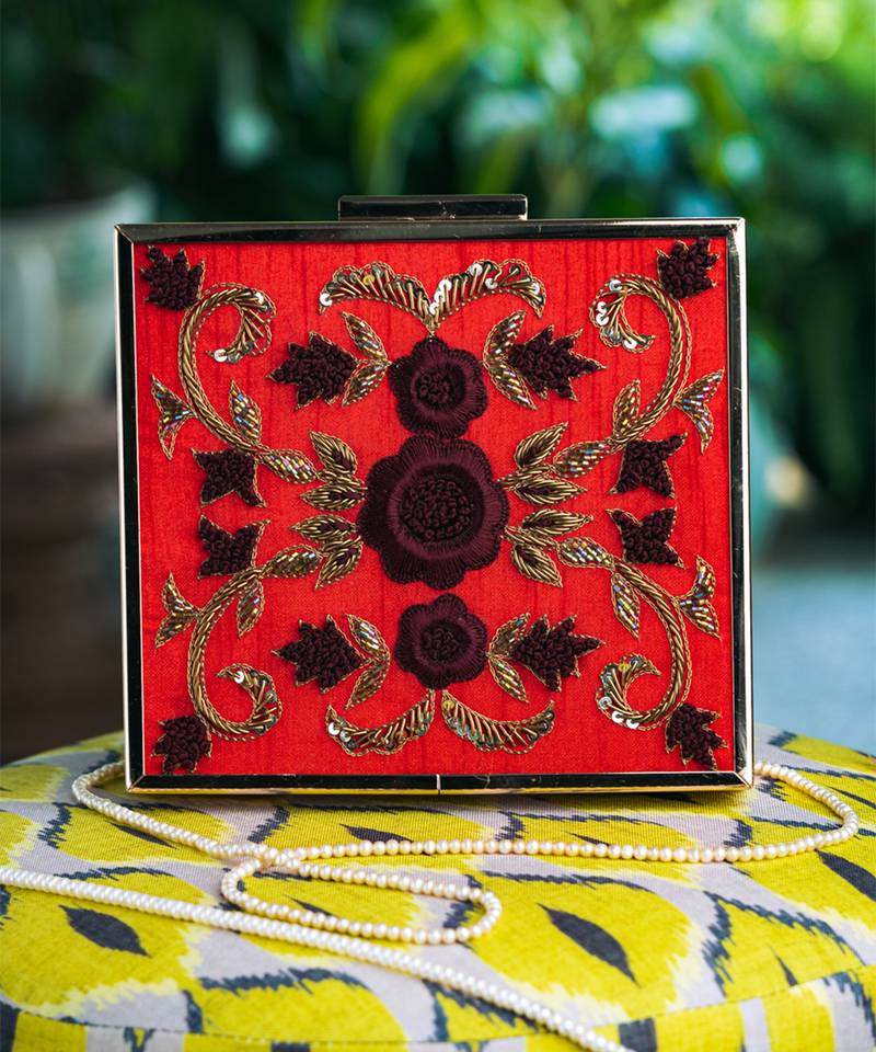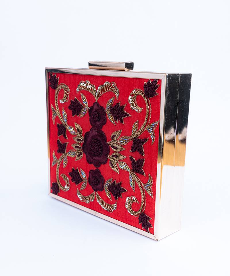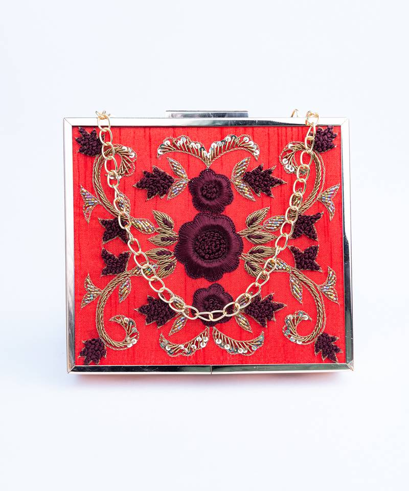 | Product Description | Embellished With Vibrant Red, Deep Wine, And Rich Gold Toned Embroidery For A Luxe, Celebratory Appeal. Structured Box Silhouette Adds Elegance And Dimension To Festive Looks. Includes One Main Compartment Secured With A Twist Closure For Secure And Easy Storage. Comes With A Shoulder Strap For Hands Free Styling And Versatile Wear. A Statement Clutch Ideal For Weddings, Receptions, And Ethnic... |