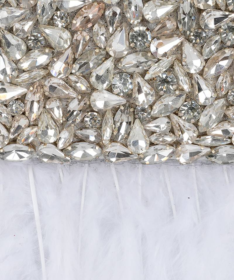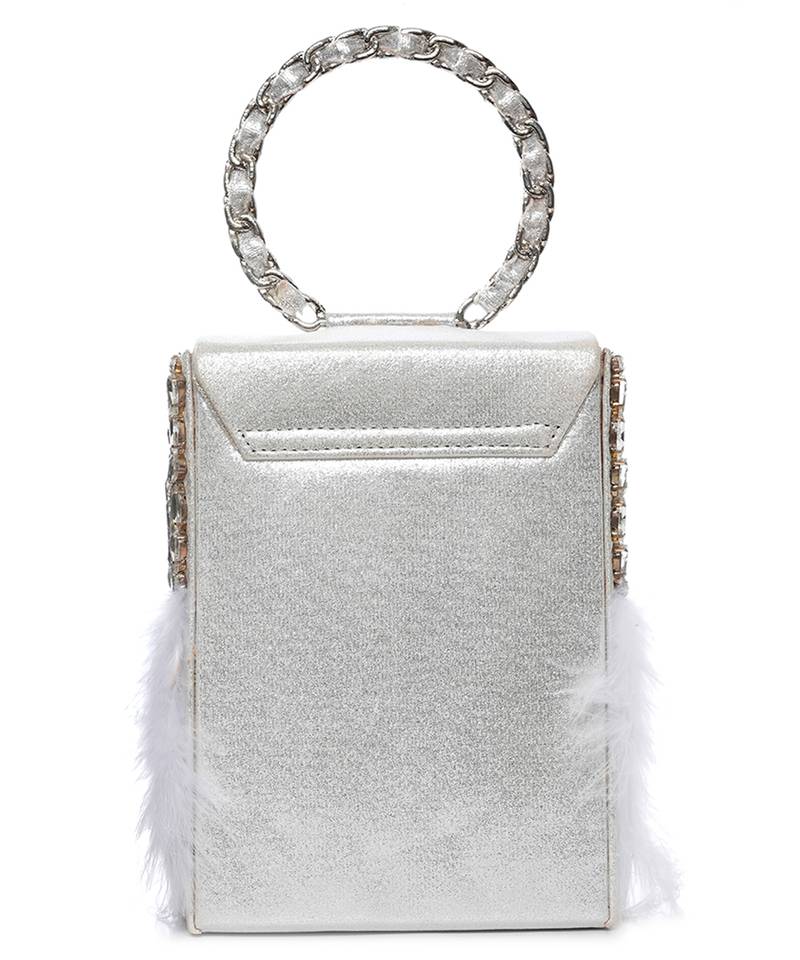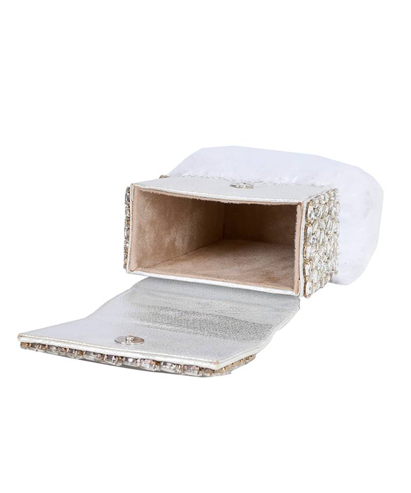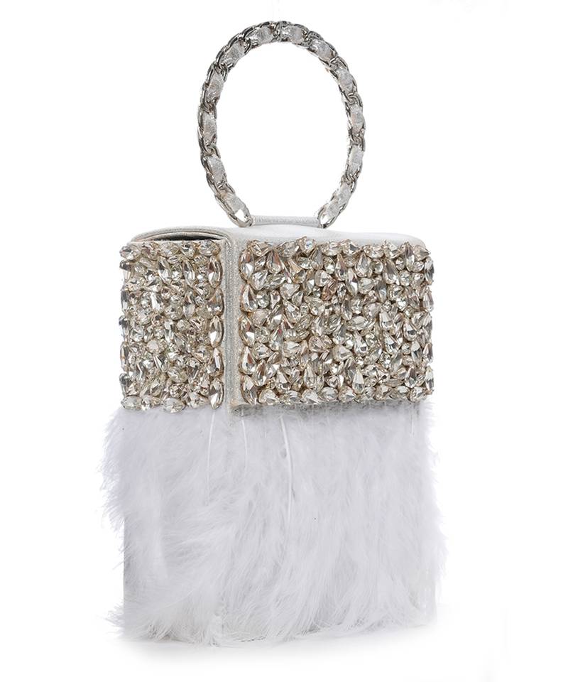 | Product Description | Box Clutch In Crisp White, Detailed With Soft Feathers And Shimmering Diamond Embellishments. Features A Sleek Round Wrist Loop For Graceful Handling. Click Lock Closure Keeps Essentials Secure In The Spacious Compartment. Ethereal And Luxurious—Ideal For Bridal Affairs, Evening Galas, Or Festive Elegance. Style Note: Style With Pearl Studded Ensembles Or Pastel Lehengas To Let The Clutch’s... |