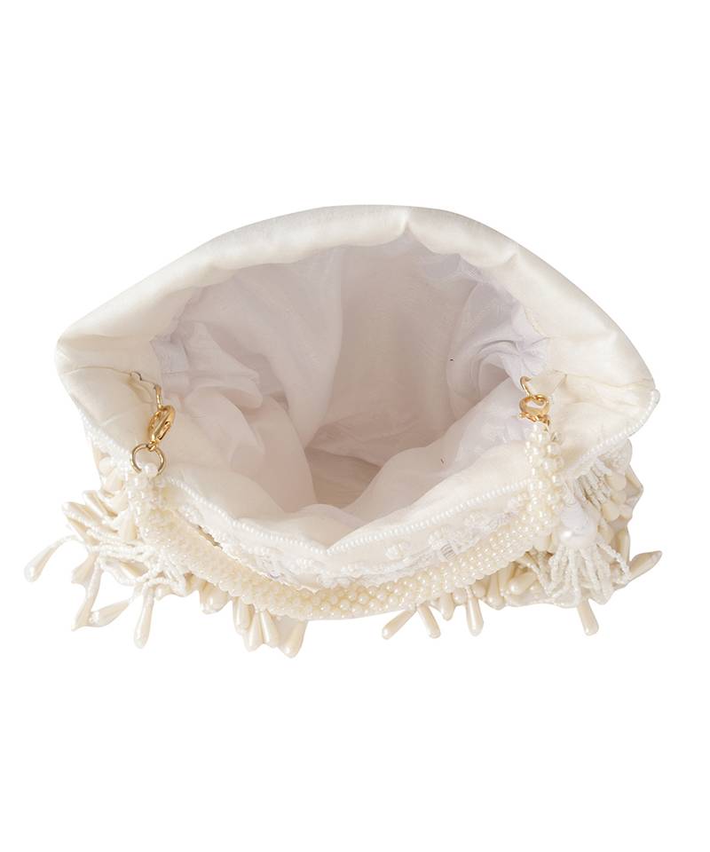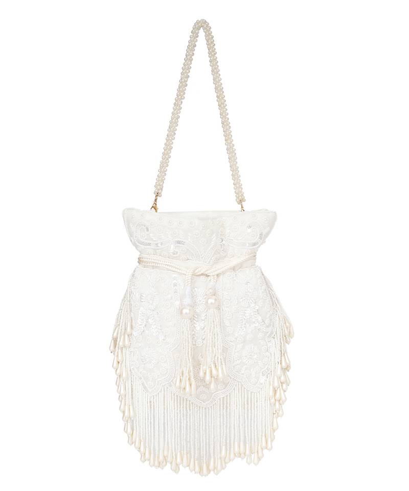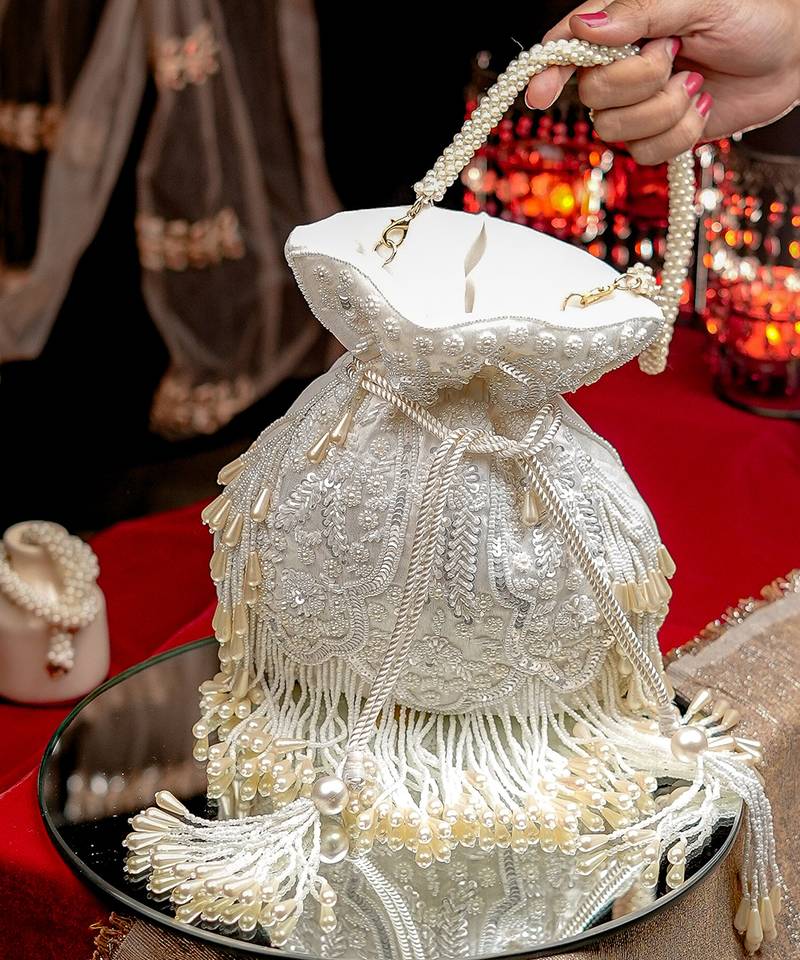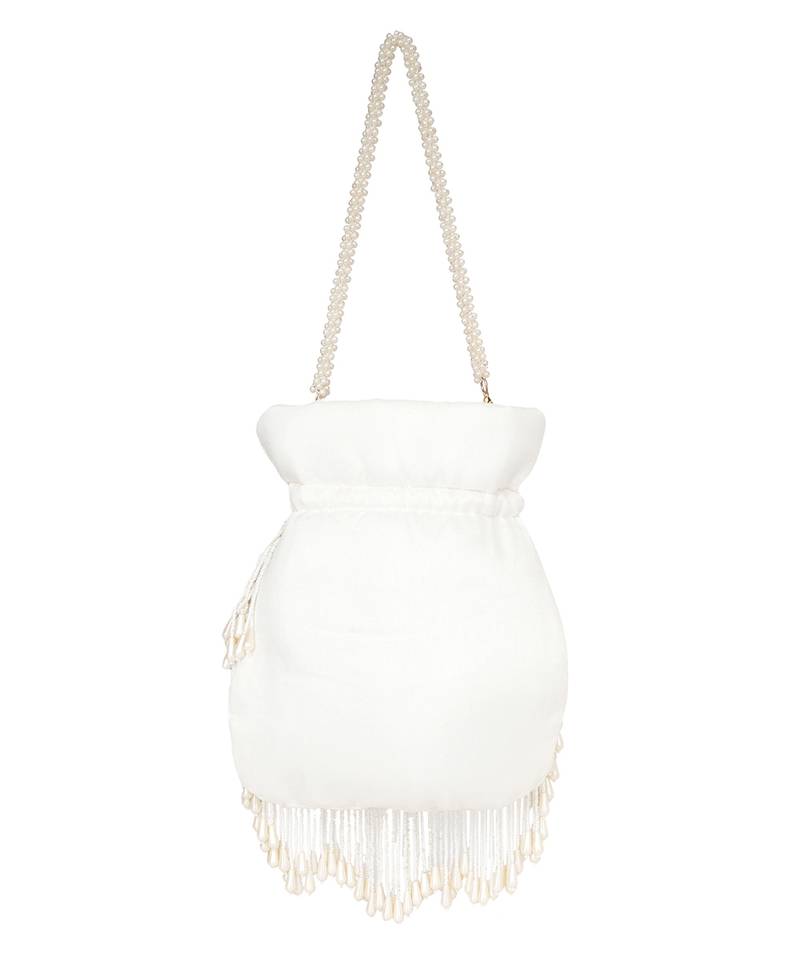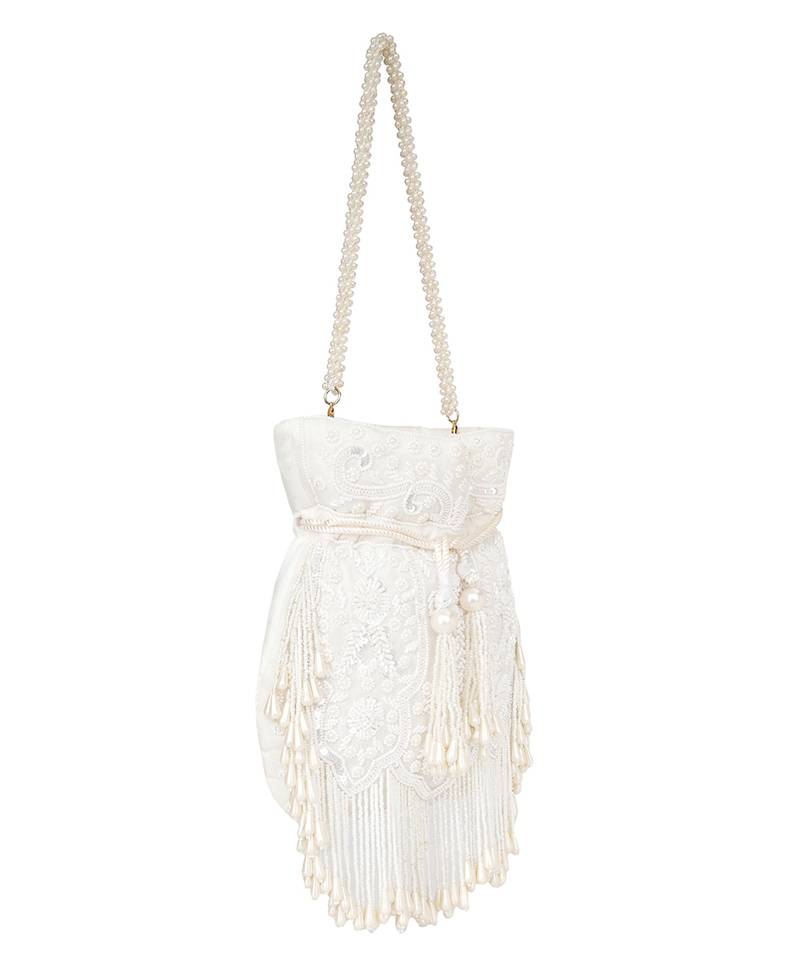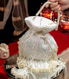 | Product Description | Pristine White Potli Clutch Enhanced With Dazzling Gold Toned Embellishments For A Rich Festive Look. One Roomy Compartment Secured With Traditional Drawstring Closure. Wrist Loop Adds Elegant Flair And Ease During Celebrations. A Refined Choice For Bridal Trousseau, Wedding Rituals, Or Festive Gifting Edits. Style Note: Best Paired With Deep Emerald Sarees, Blush Lehengas, Or Golden Anarkalis... |