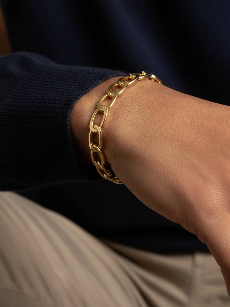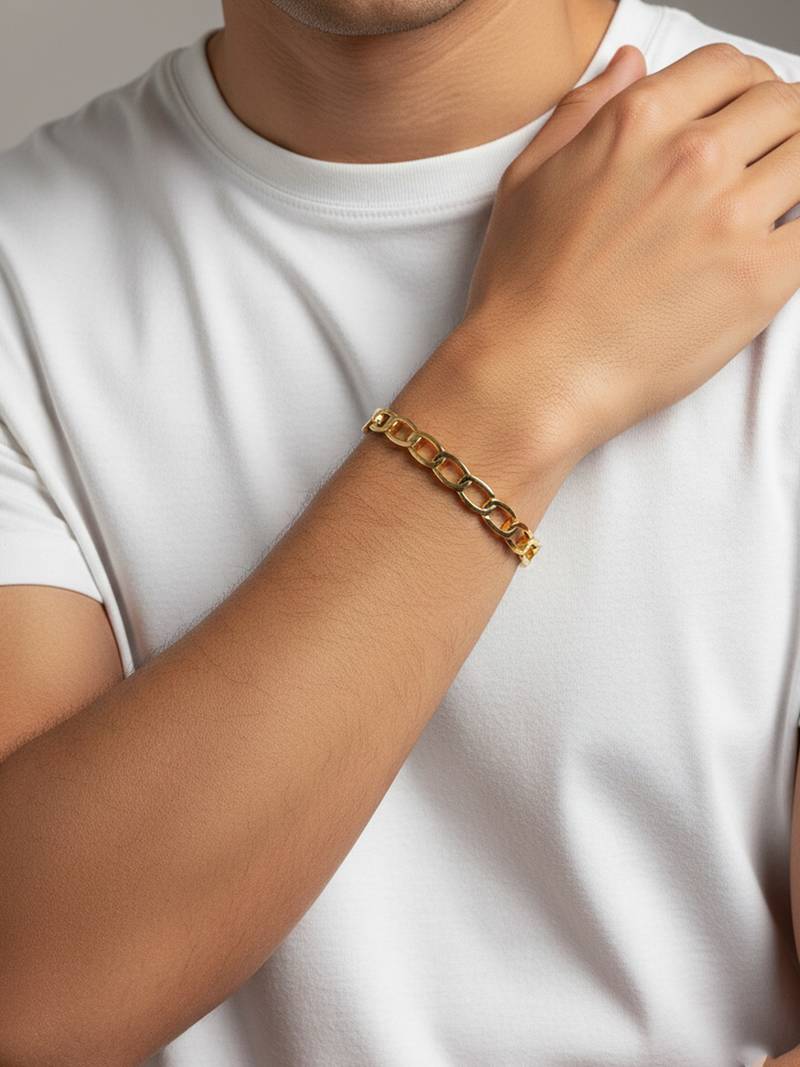 | Product Description | Men's Gold Plated Cuff Bracelet This Men’s Gold Chain Link Open Cuff Bracelet Is Designed For Bold Everyday Styling. Crafted With Interlocking Oval Links In A Matte Gold Finish, It Delivers A Rugged Yet Refined Look. The Open Cuff Design Ensures Easy Wear And A Comfortable, Adjustable Fit. Perfect For Pairing With Casual Outfits Or Adding An Edgy Touch To Smart Attire, This Bracelet Is A Versatile Accessory That Complements A Confident, Contemporary Style. |