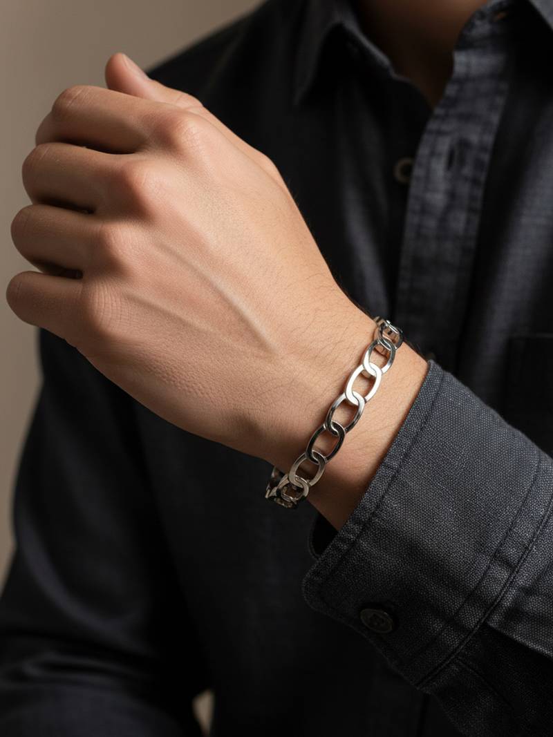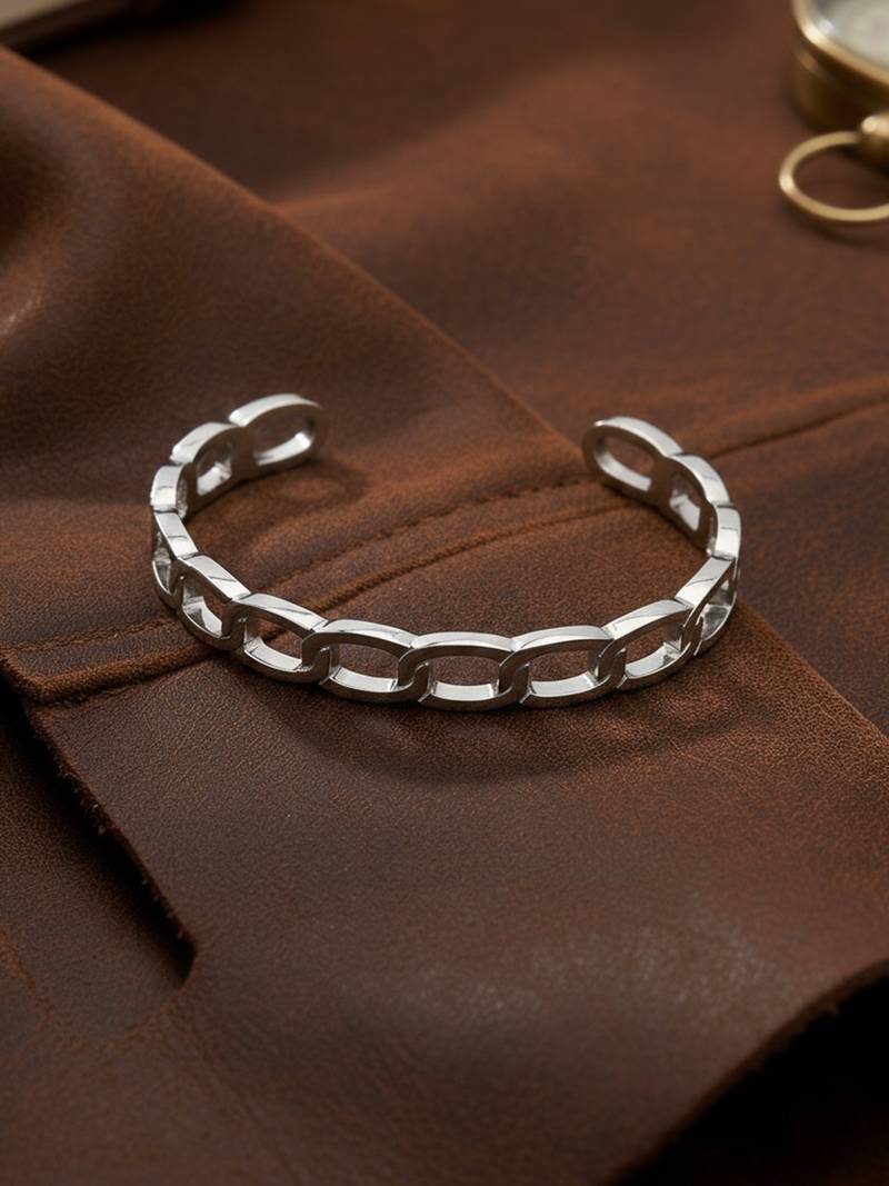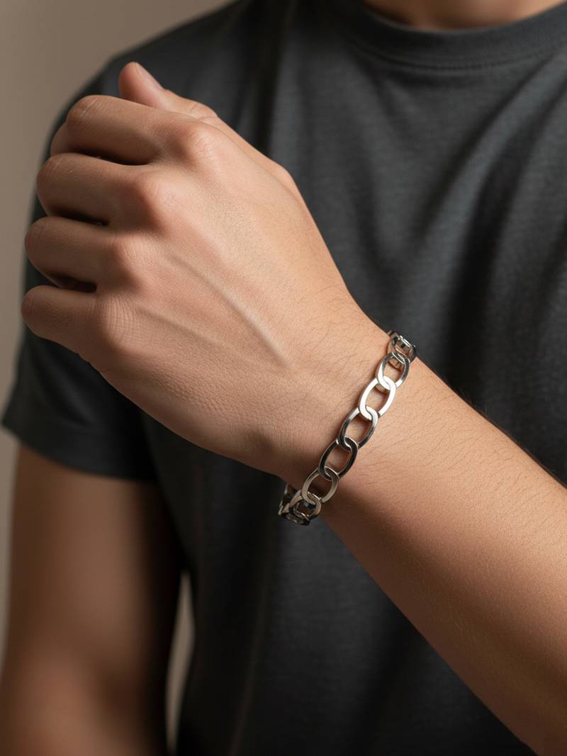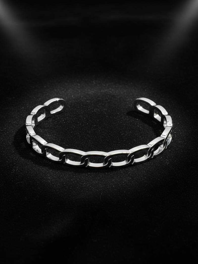 | Product Description | Men's Silver Plated Cuff Bracelet This Men’s Silver Chain Link Open Cuff Bracelet Is Designed For Bold Everyday Styling. Crafted With Interlocking Oval Links In A Matte Silver Finish, It Delivers A Rugged Yet Refined Look. The Open Cuff Design Ensures Easy Wear And A Comfortable, Adjustable Fit. Perfect For Pairing With Casual Outfits Or Adding An Edgy Touch To Smart Attire, This Bracelet Is A Versatile Accessory That Complements A Confident, Contemporary Style. |
