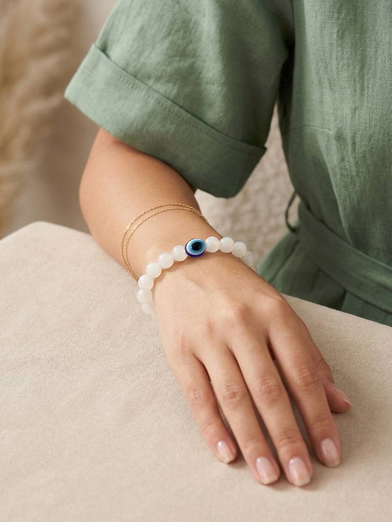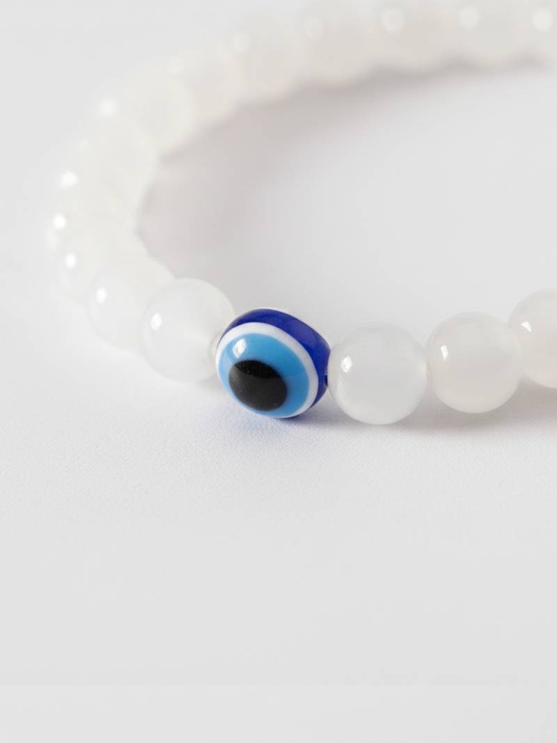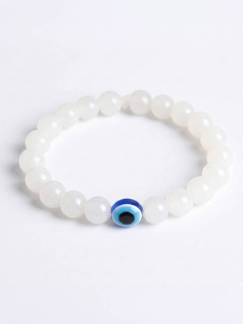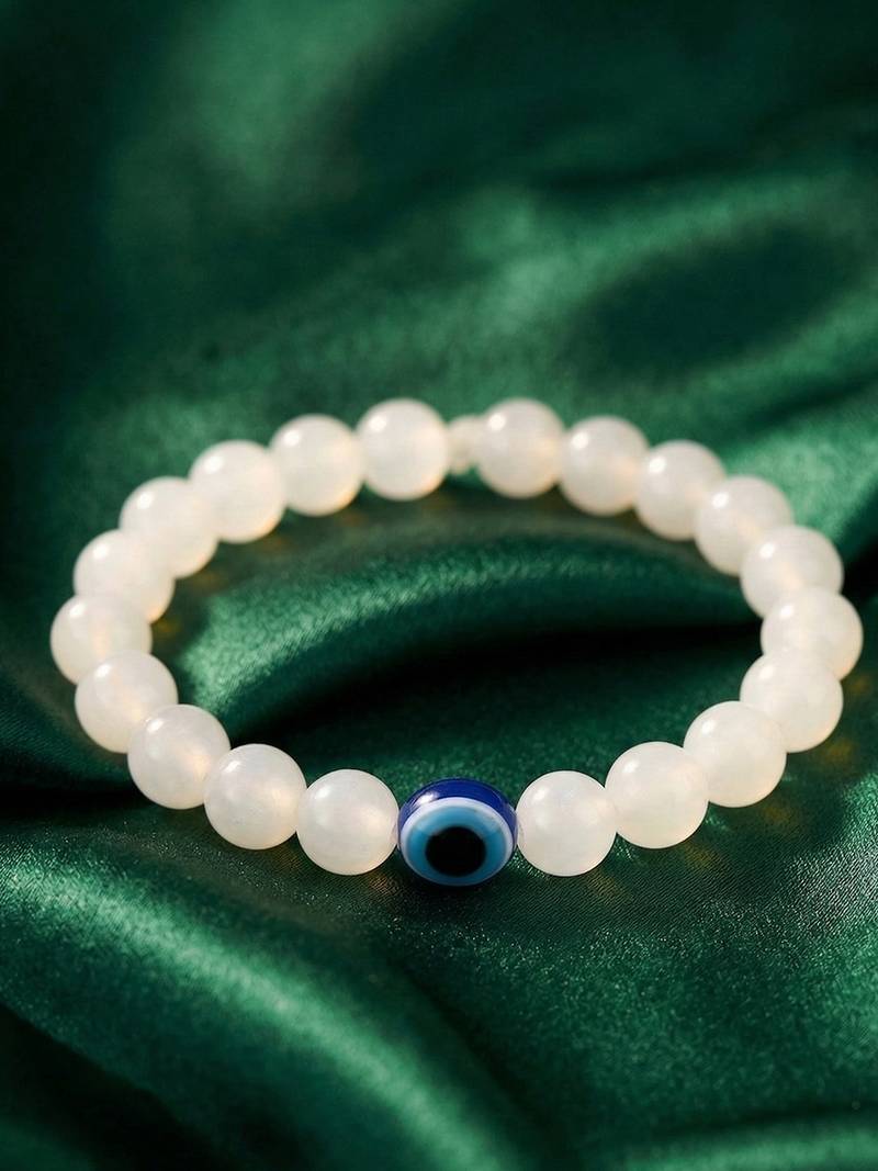 | Product Description | White Crystal Evil Eye Bracelet This Unisex White Pearl Bead Bracelet Combines Elegance With Protective Symbolism. Crafted With Smooth, Luminous White Beads, The Design Is Accented By A Striking Blue Evil Eye Charm At The Center, Believed To Attract Positivity And Ward Off Negative Energy. The Stretchable Band Ensures A Comfortable And Secure Fit For Everyday Wear. Perfect For Both Men And Women, This Bracelet Adds A Refined Touch To Any Outfit While Carrying A Timeless Spiritual Charm. |