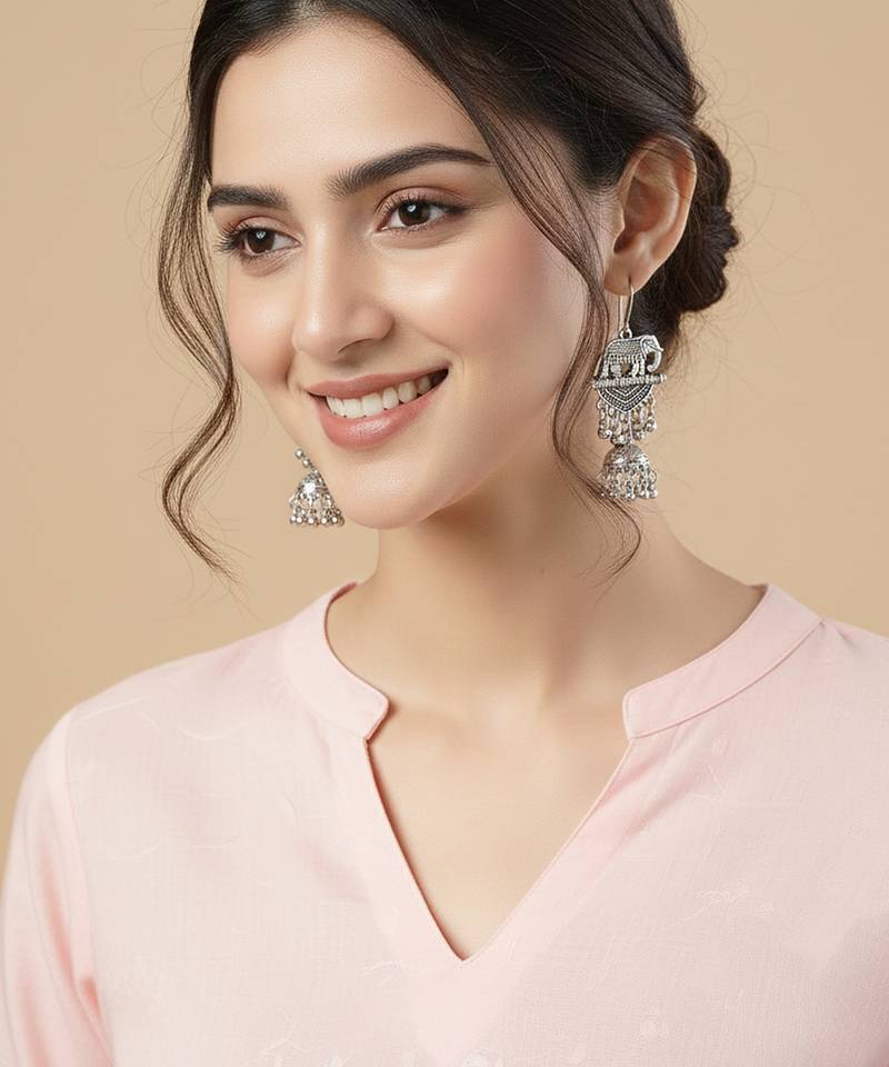 | Product Description | Women Elephant Design German Silver Oxidised Jhumka Earrings Celebrate Traditional Artistry With These Stunning Antique Silver Jhumka Earrings. Featuring A Beautifully Detailed Elephant Motif At The Top, These Earrings Symbolize Strength And Grace. The Intricately Designed Dome Shaped Jhumka Is Adorned With Delicate Carvings And Finished With Dangling Bead Accents That Create Graceful Movement And A Soft, Melodic Charm. Perfect For Festive Occasions, Cultural Events, And Weddings, These Statement Earrings Add A Touch Of Heritage Elegance And Timeless Beauty To Any Ethnic Ensemble. |