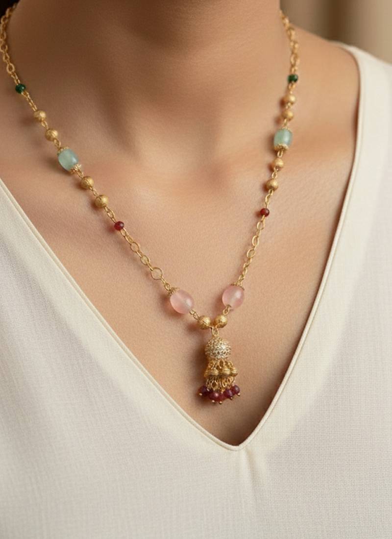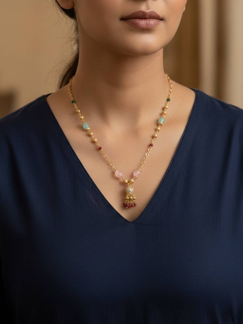 | Product Description | Women Gold Plated Multicolour Chain This Women’s Multicolour Gold Tone Chain Features Charming Floral Inspired Accents With Tiny Dangling Details That Create Graceful Movement. The Finely Crafted Design Adds A Soft Shimmer, Beautifully Enhancing The Neckline With A Feminine Touch. Perfect For Festive Occasions, Parties, Or Elegant Evening Wear, This Chain Blends Subtle Glamour With Timeless Sophistication. Lightweight And Comfortable, It’s An Ideal Statement Piece To Elevate Both Traditional And Modern Outfits. |