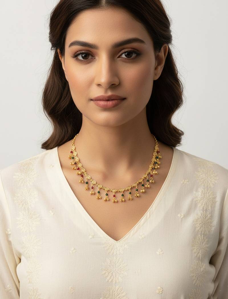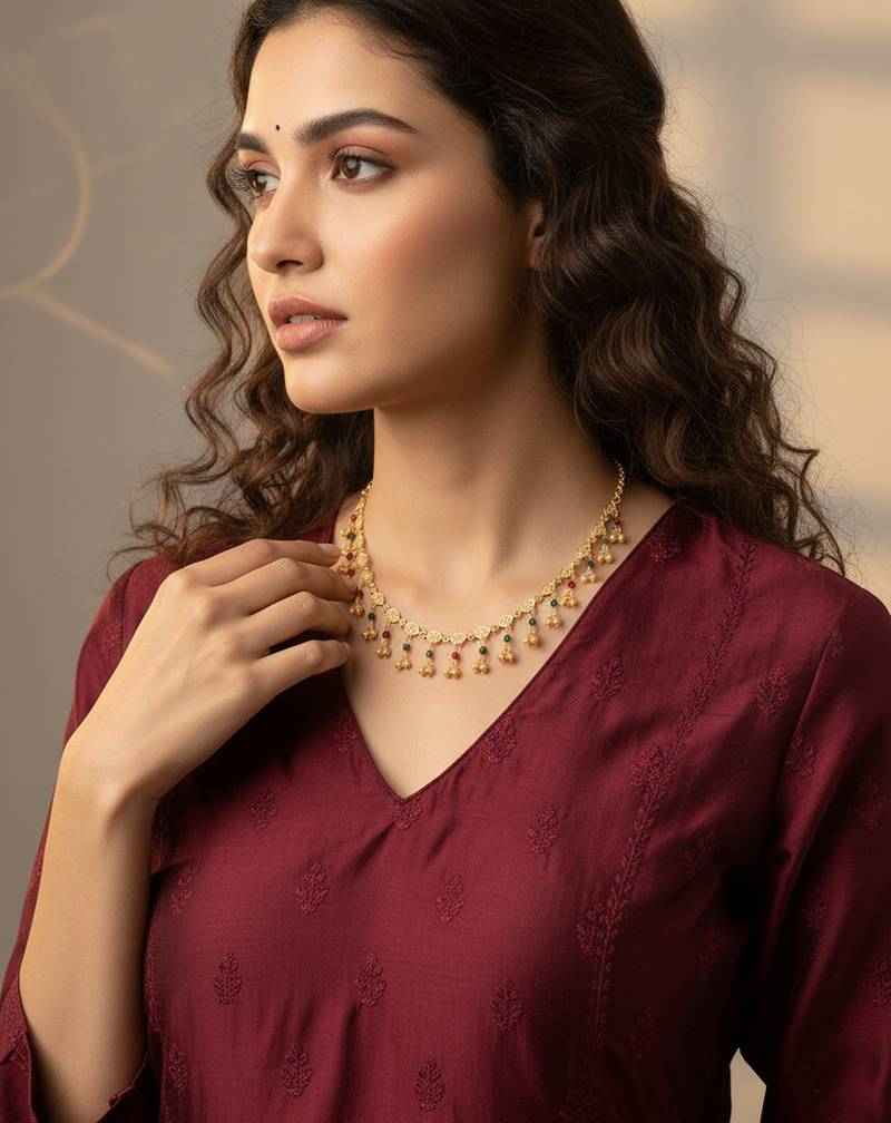 | Product Description | Women Gold Plated Multicolour Minimal Chain This Women’s Multicolour Gold Tone Chain Features Charming Floral Inspired Accents With Tiny Dangling Details That Create Graceful Movement. The Finely Crafted Design Adds A Soft Shimmer, Beautifully Enhancing The Neckline With A Feminine Touch. Perfect For Festive Occasions, Parties, Or Elegant Evening Wear, This Chain Blends Subtle Glamour With Timeless Sophistication. Lightweight And Comfortable, It’s An Ideal Statement Piece To Elevate Both Traditional And Modern Outfits. |