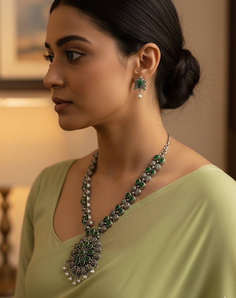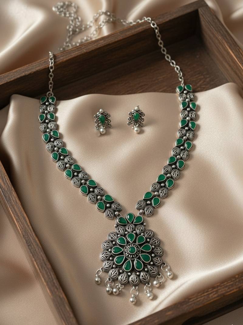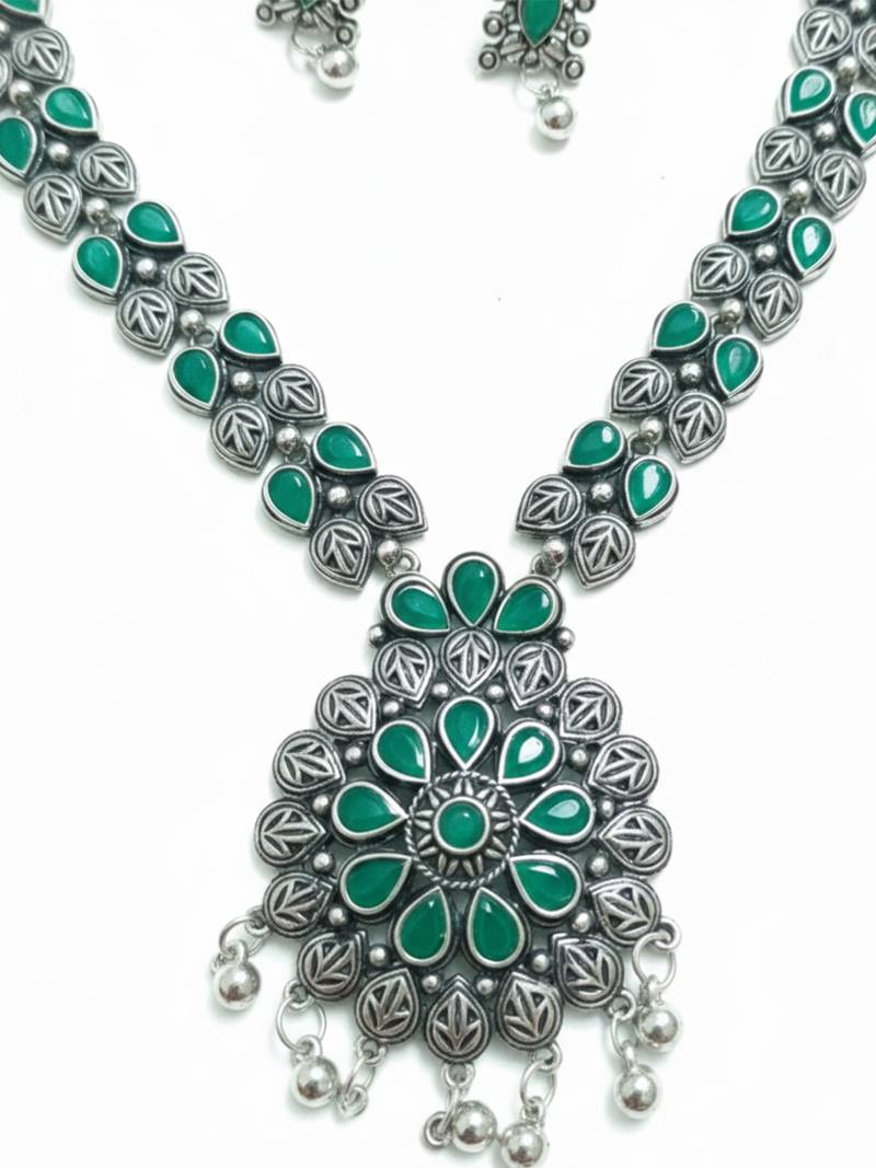 Product Name Nvr Women Oxidised Silver Finish Necklace & Earrings Set With Green Stones