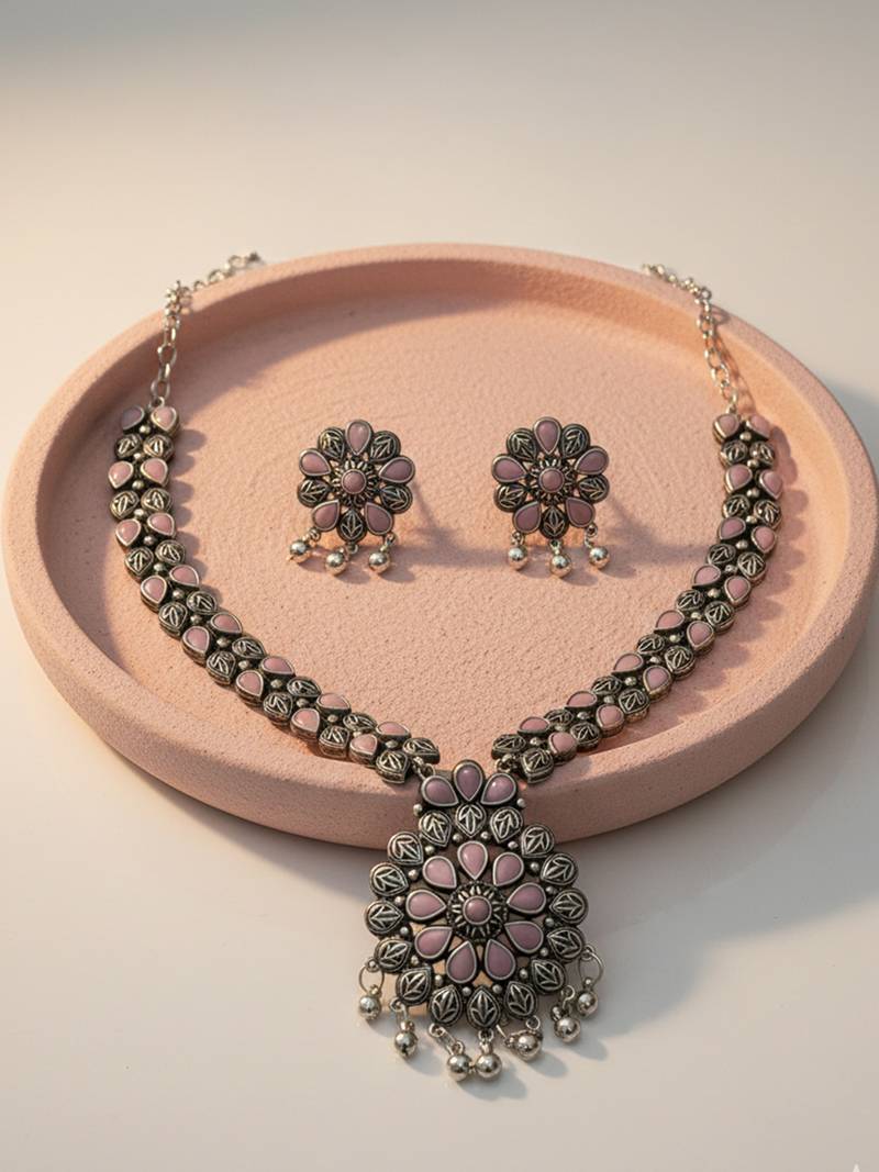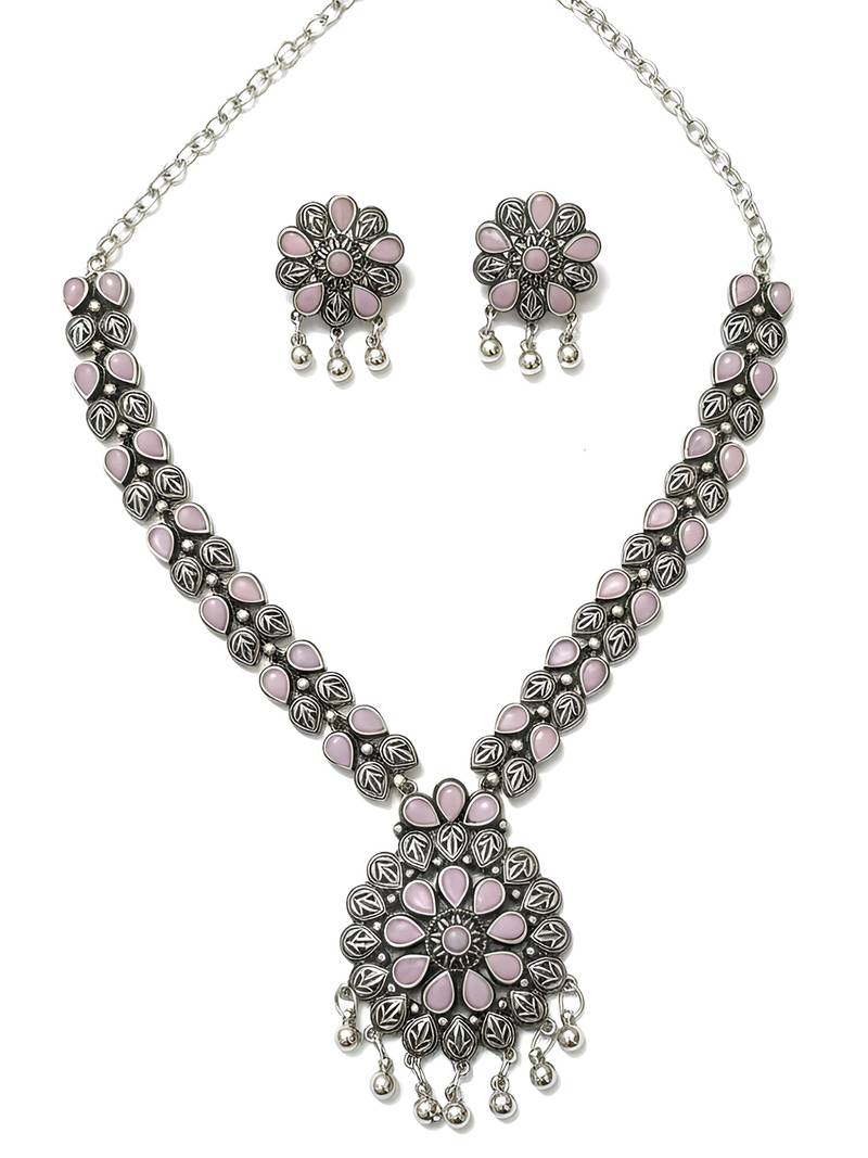 | Product Name | Nvr Women Oxidised Silver Finish Necklace & Earrings Set With Pink Stones | |