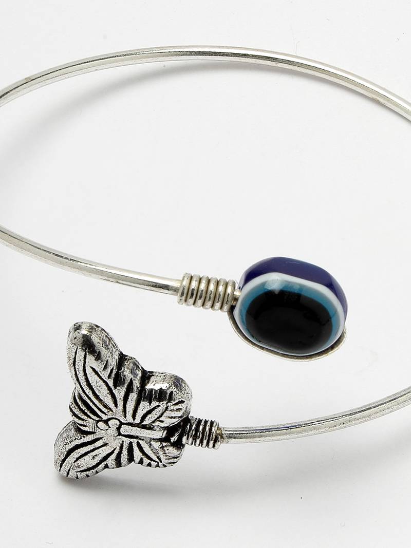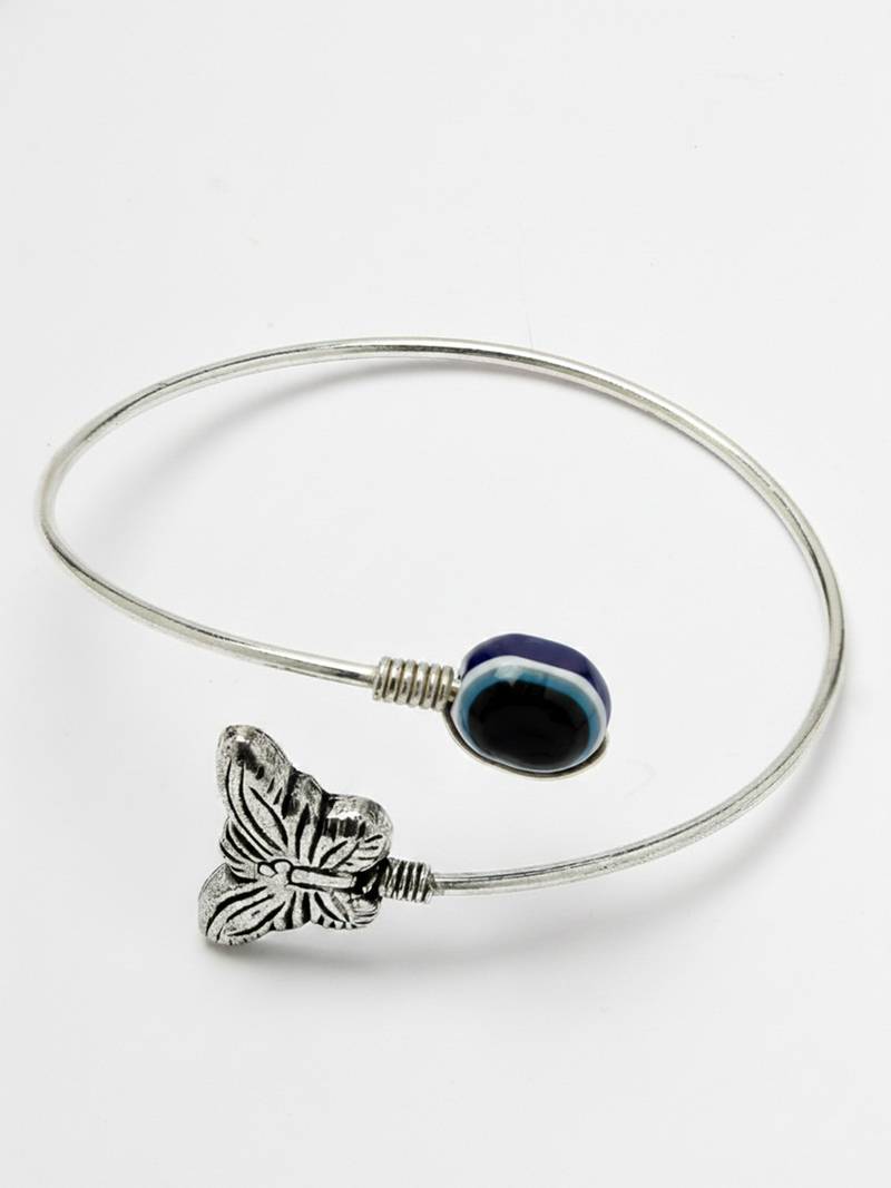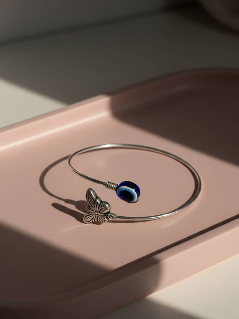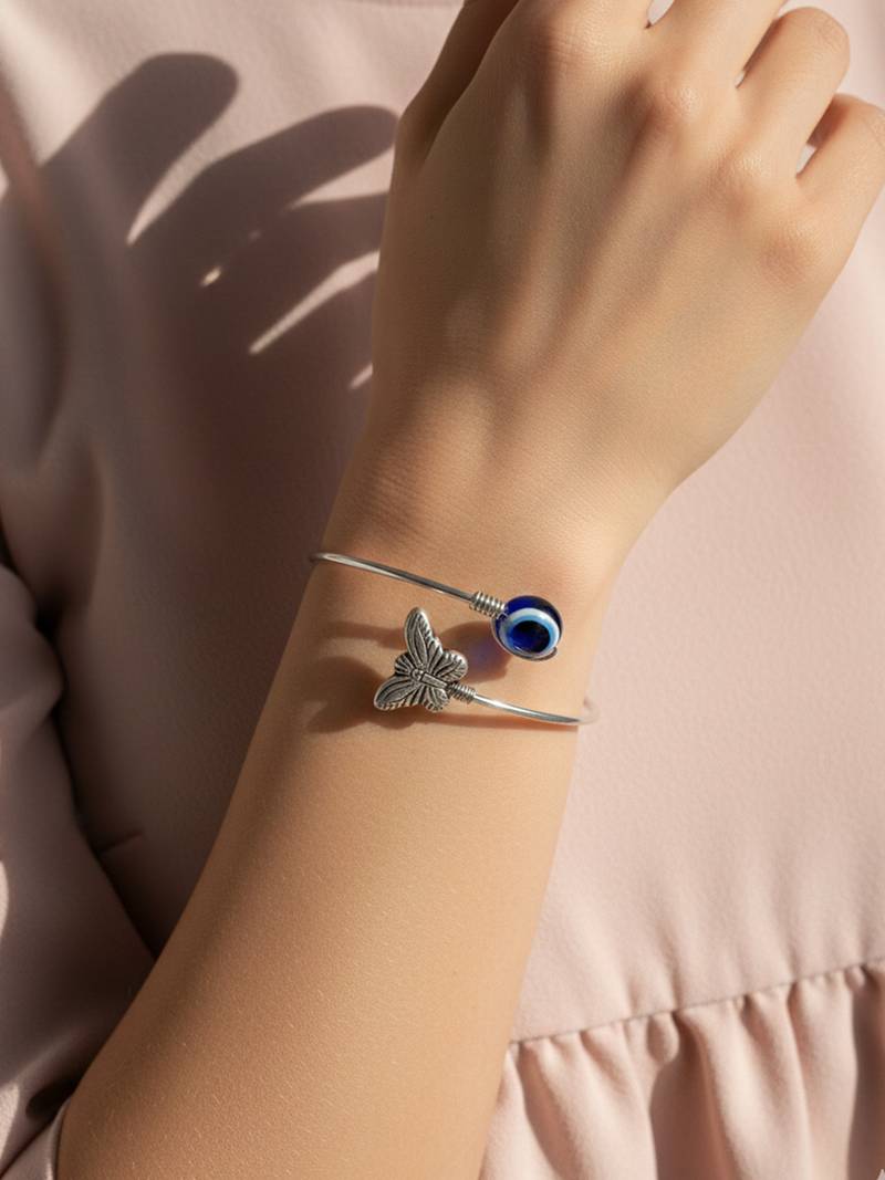 | Product Description | Women Rhodium Plated Evil Eye Kada Bracelet This Women’s Open Cuff Bracelet Beautifully Blends Elegance With Symbolism. Crafted In A Sleek Silver Tone Finish, The Design Features A Detailed Butterfly Motif On One End And A Striking Blue Evil Eye Charm On The Other. The Open Cuff Style Allows For Easy Wear And A Comfortable Adjustable Fit. Symbolizing Transformation And Protection, This Bracelet Adds A Graceful Yet Meaningful Touch To Both Everyday Outfits And Special Occasion Looks. |