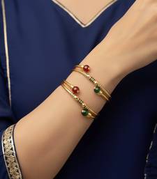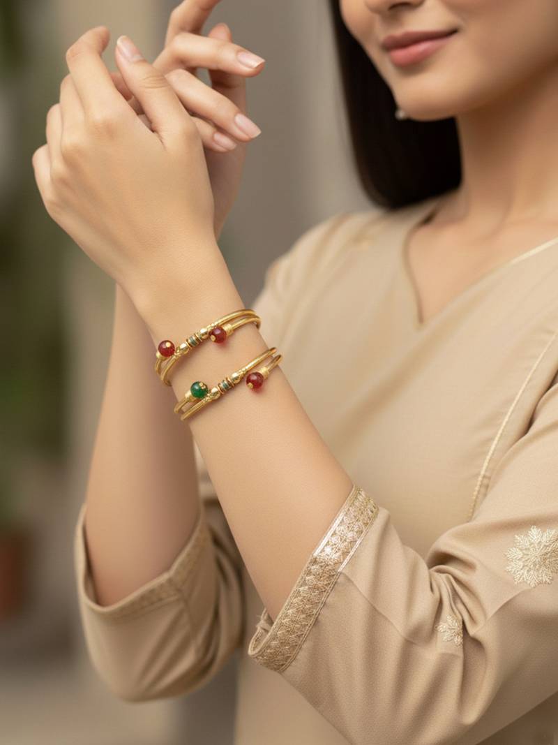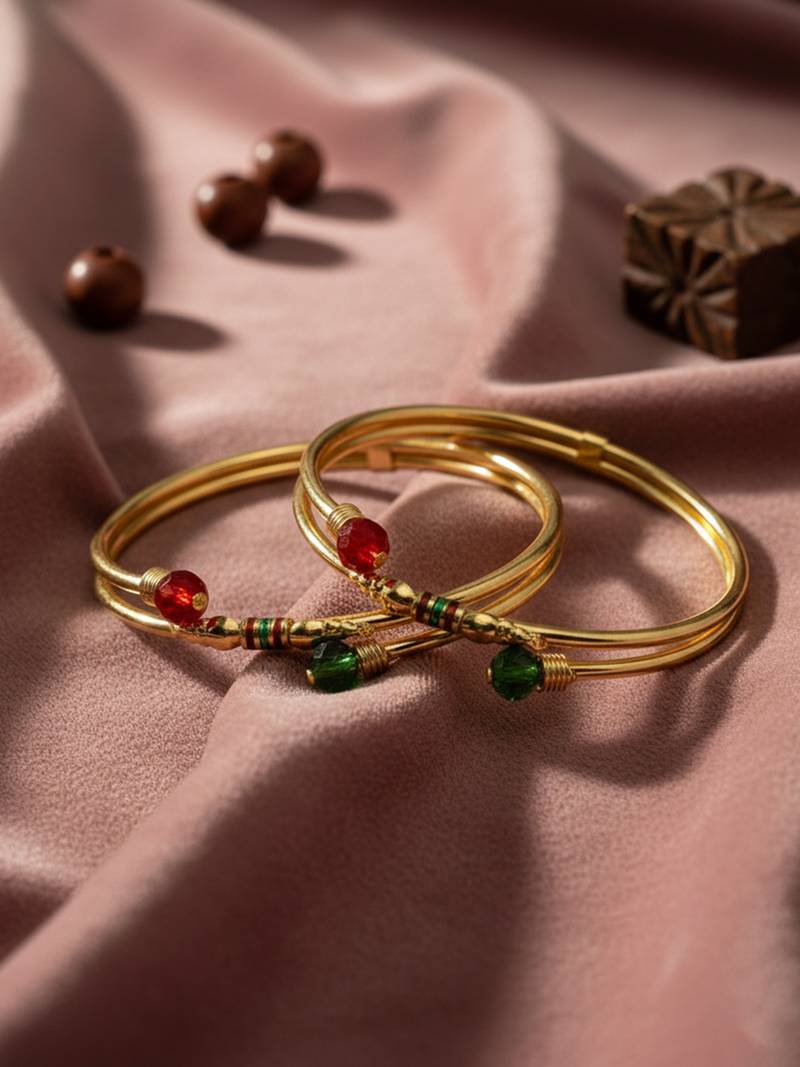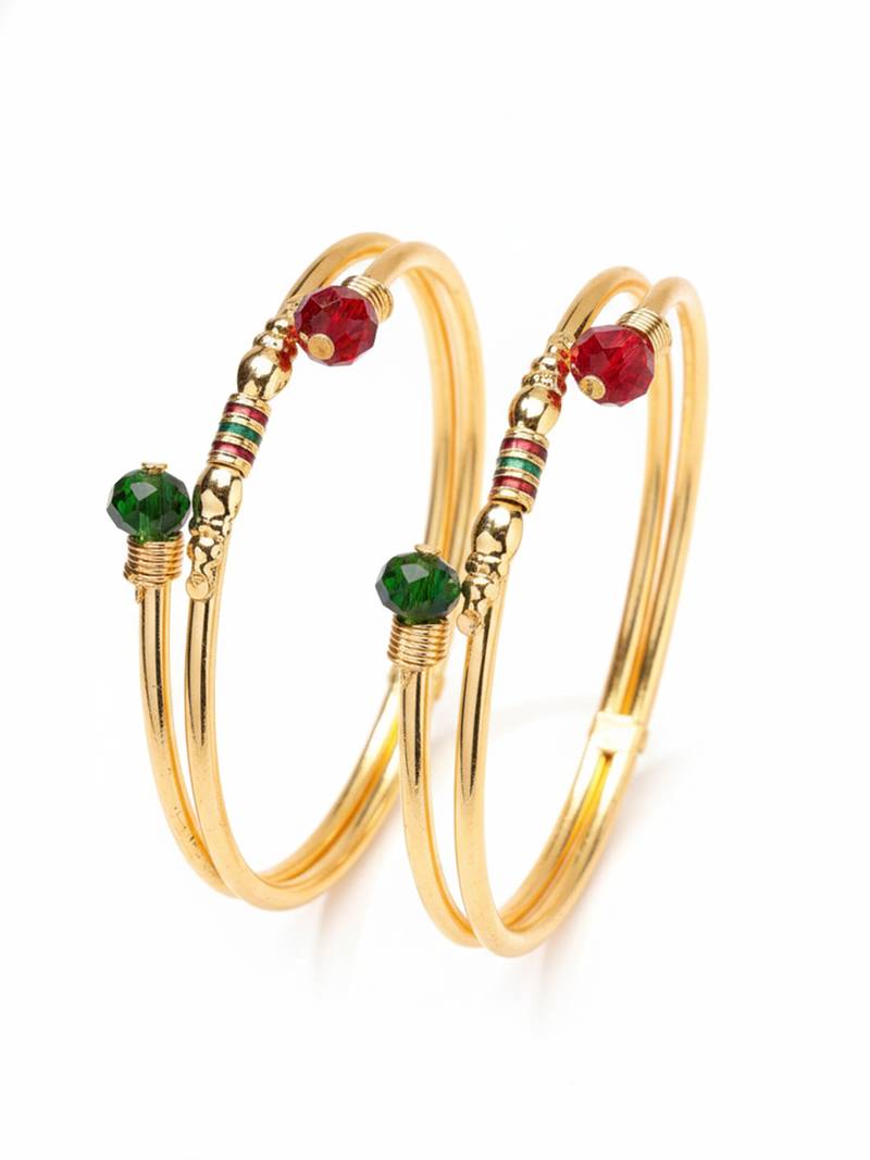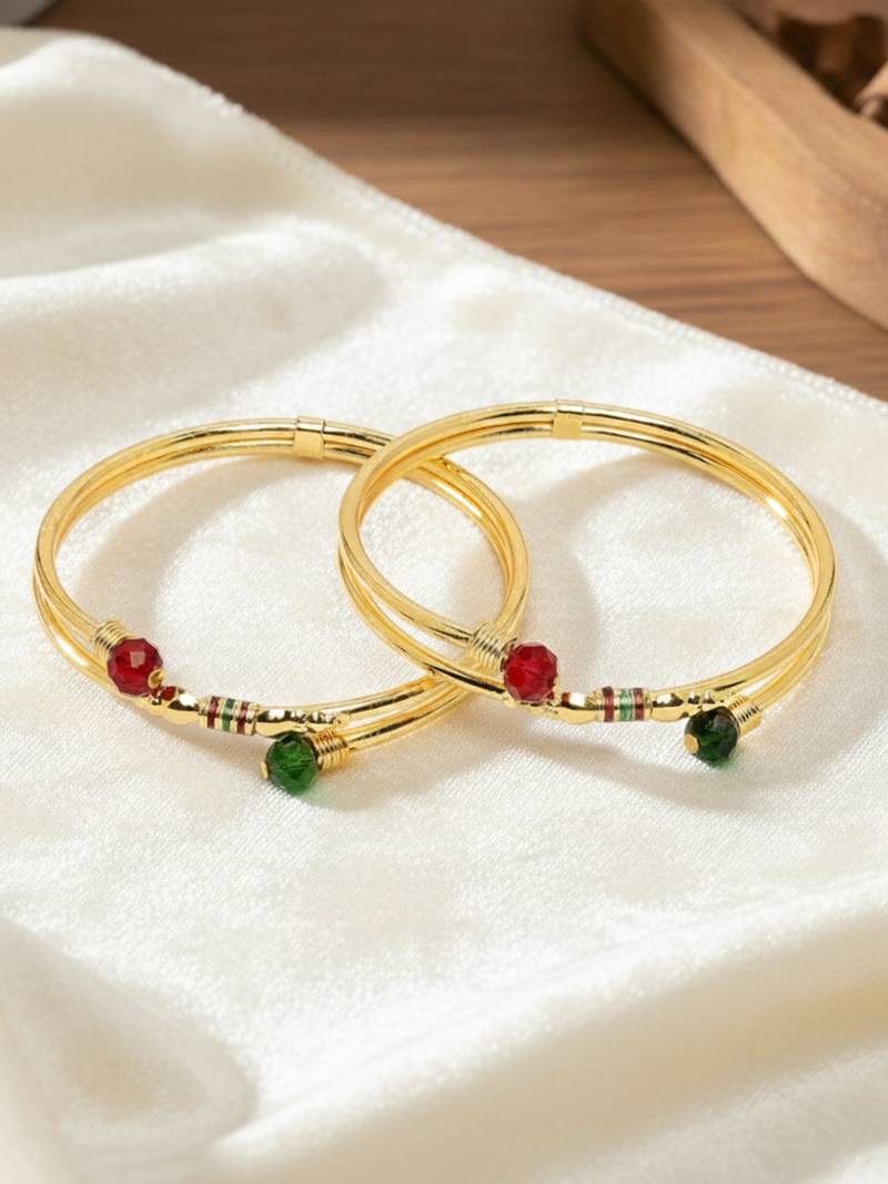 | Product Description | Women Set Of 2 Gold Plated Artificial Beads Bangle These Women’s Gold Tone Bangles Are Beautifully Accented With Colorful Gemstone Details That Add A Refined Touch Of Charm. Featuring A Sleek Double Band Design, Each Bangle Is Adorned With Delicate Beadwork And Rich Red And Green Stone Accents That Enhance The Warm Golden Finish. Lightweight And Graceful, They Are Perfect For Festive Occasions, Weddings, And Traditional Celebrations. Wear Them Together For A Striking Statement Or Pair Them With Other Jewelry For A Complete, Sophisticated Look. |