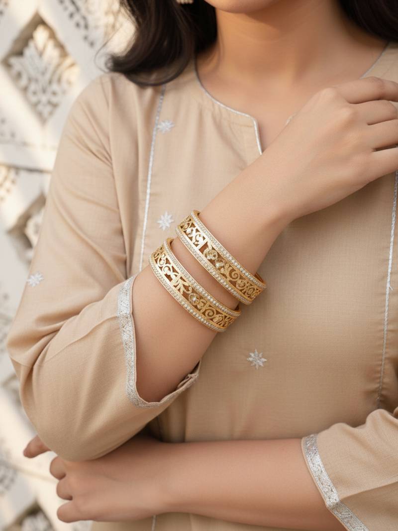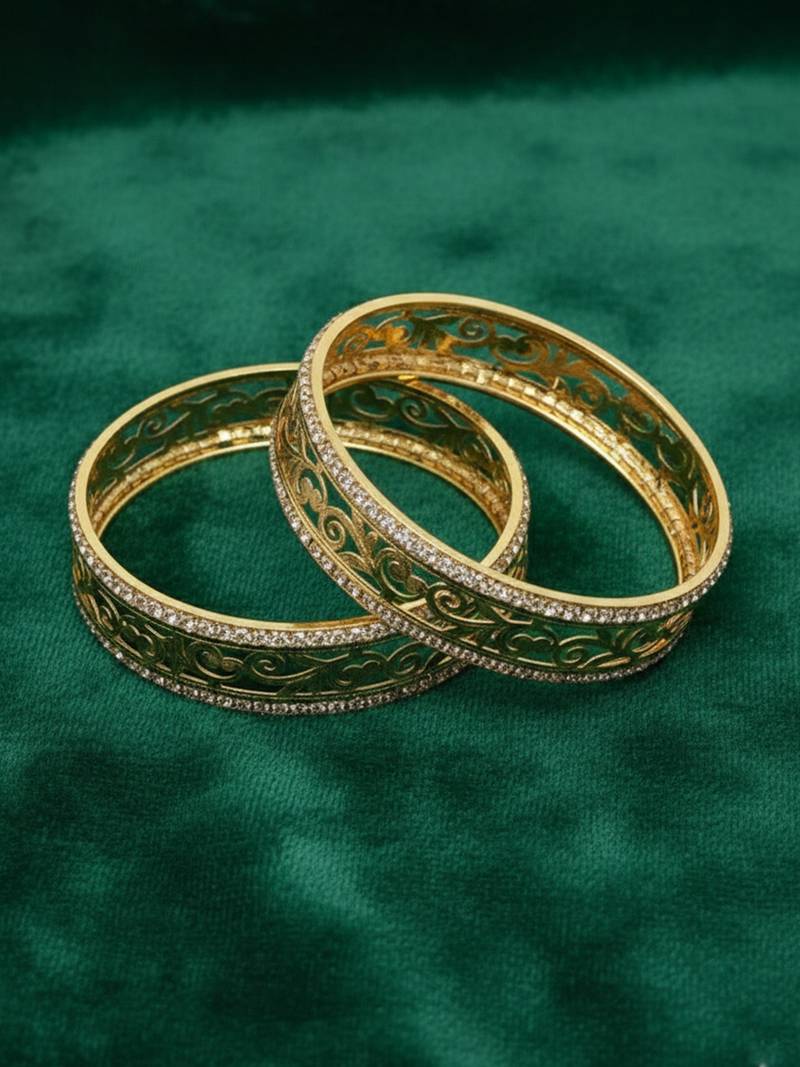 | Product Description | Women Set Of 2 Gold Plated Cz Stone Kada Bangle These Women’s Gold Tone Bangles Feature Intricate Filigree Detailing That Showcases Delicate Scrollwork Patterns Across The Surface. The Elegant Cutwork Design Adds Depth And Texture, Beautifully Enhancing The Rich Golden Shine. Crafted To Offer A Regal And Sophisticated Look, These Bangles Are Perfect For Weddings, Festive Celebrations, And Traditional Occasions. Wear Them Together For A Bold Statement Or Pair Them With Other Gold Jewelry To Complete A Graceful, Classic Ensemble. |