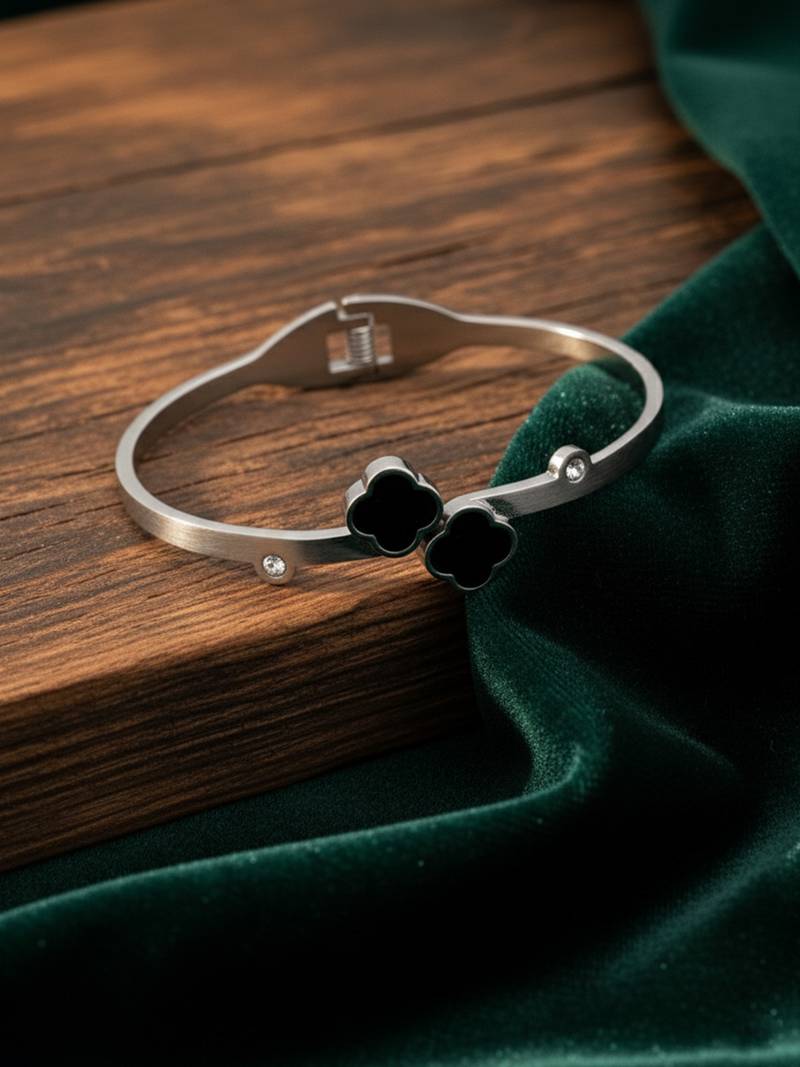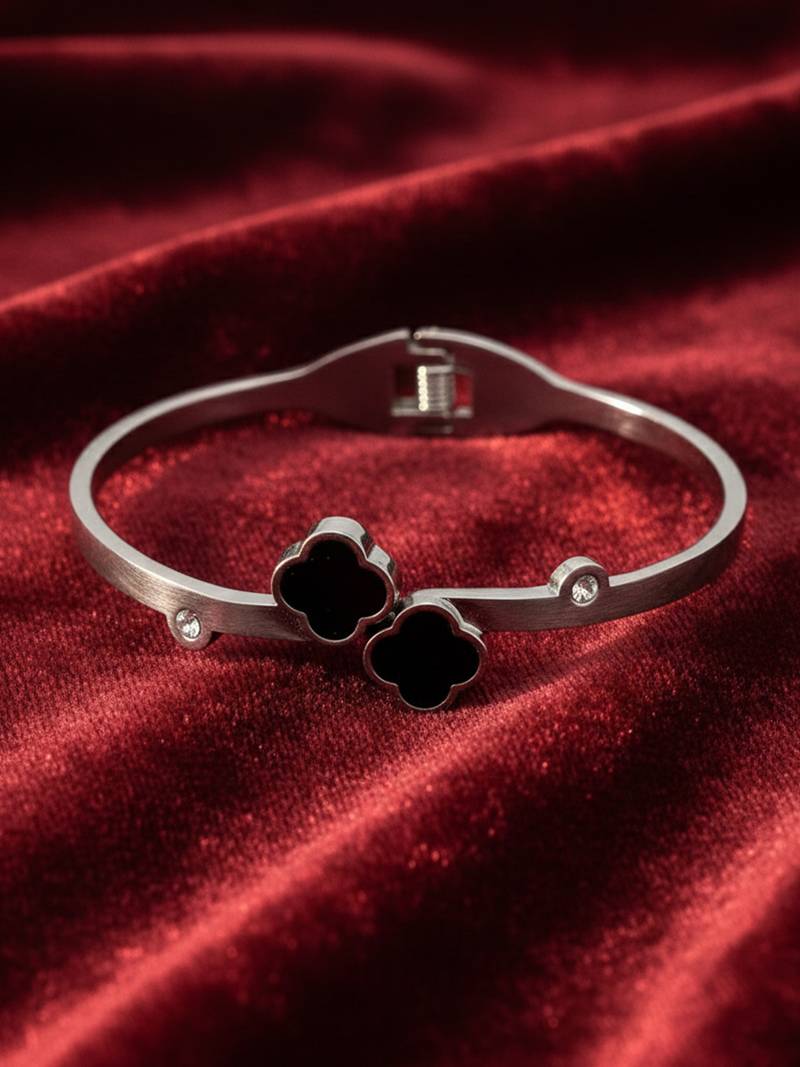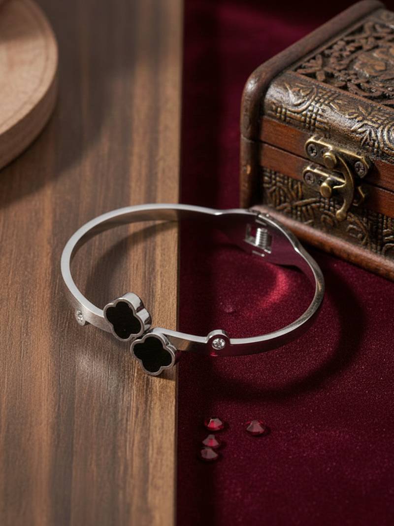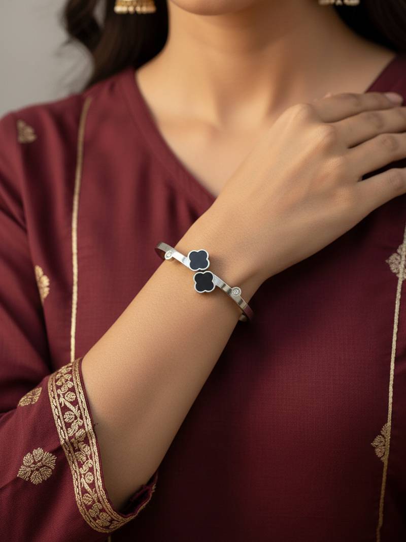 | Product Description | Women Silver Plated Black Cuff Bracelet This Women’s Silver Open Cuff Bracelet Features A Sleek Polished Finish Accented With Elegant Black Clover Motifs. The Glossy Clover Charms Add A Bold Contrast, Symbolizing Luck And Timeless Style. Designed With A Structured Open Cuff And Secure Hinge Closure, It Offers Both Comfort And Durability For Everyday Wear. Perfect For Pairing With Casual Outfits Or Dressing Up For Special Occasions, This Bracelet Adds A Refined And Modern Touch To Any Look. |