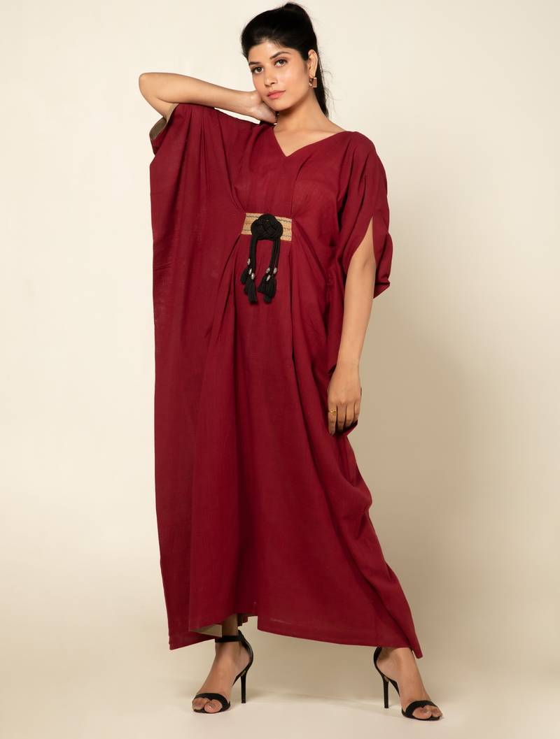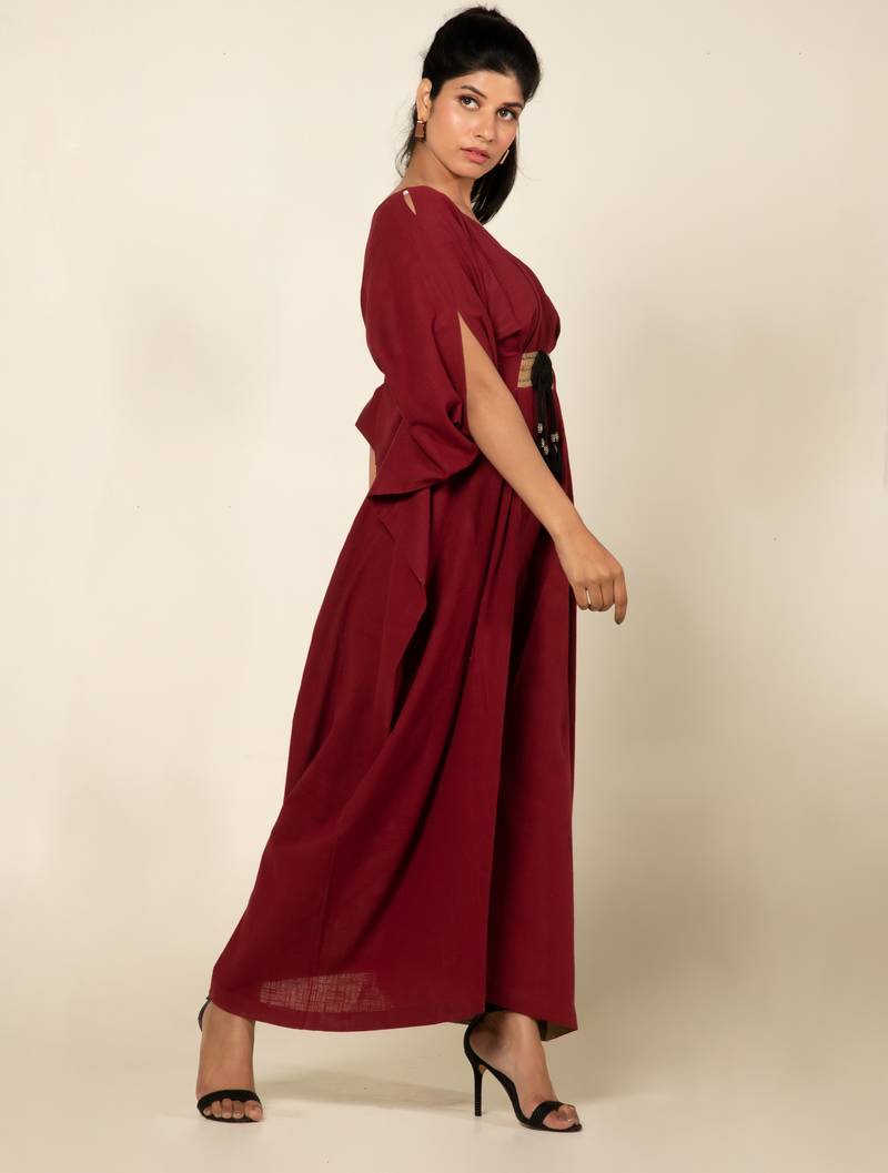 | Product Description | A Striking Ode To Effortless Elegance. Crafted In Rich Maroon Toned Linen Slub, This Relaxed Jumpsuit Features A Flattering V Neckline, Dramatic Draped Sleeves And A Cinched Waist With A Textured Jute Belt Like Statement Detailing. Designed For Movement And Flair, The Flowy Structure Mimics A Kaftan While Offering The Ease Of A Jumpsuit, Making It Your Go To Piece For Destination Evenings, Sundowner Get Togethers Or Artistic Escapes. It’s Bold, Breathable And Beautifully Bohemian. |