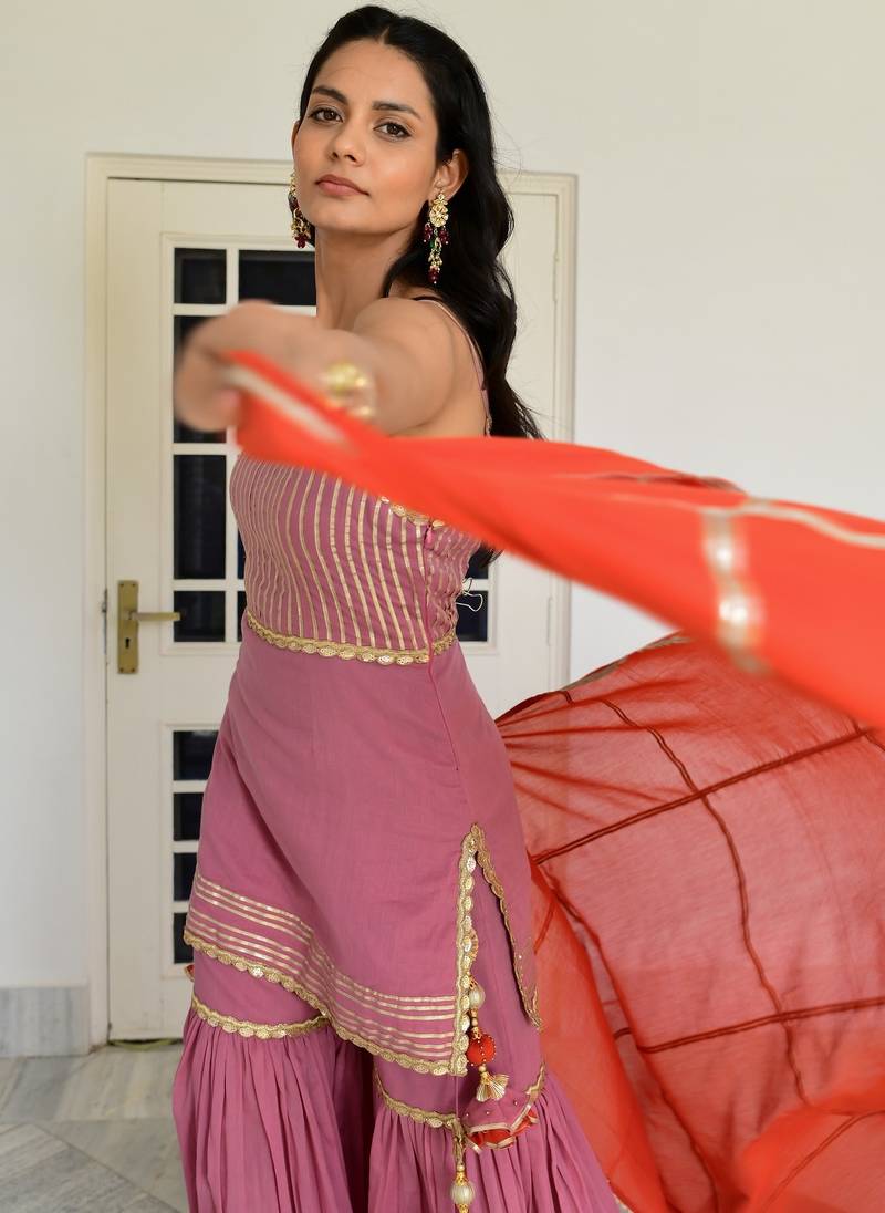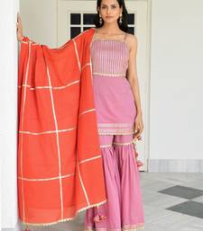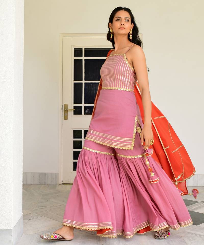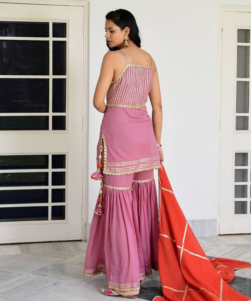 | Product Description | Turn Heads In This Chic Lavender And Coral Sharara Set. The Lavender Kurta Features A Striped Yoke With Gota Detailing And A Delicate Scalloped Neckline, Paired With A Matching Flared Sharara Embellished With Golden Trims And Tassels On The Sides. The Vibrant Coral Dupatta With Gold Checkered Gota Lines And Dainty Tassels Adds A Bold Contrast, Making This Ensemble Perfect For Festive Celebrations And Daytime Functions. |