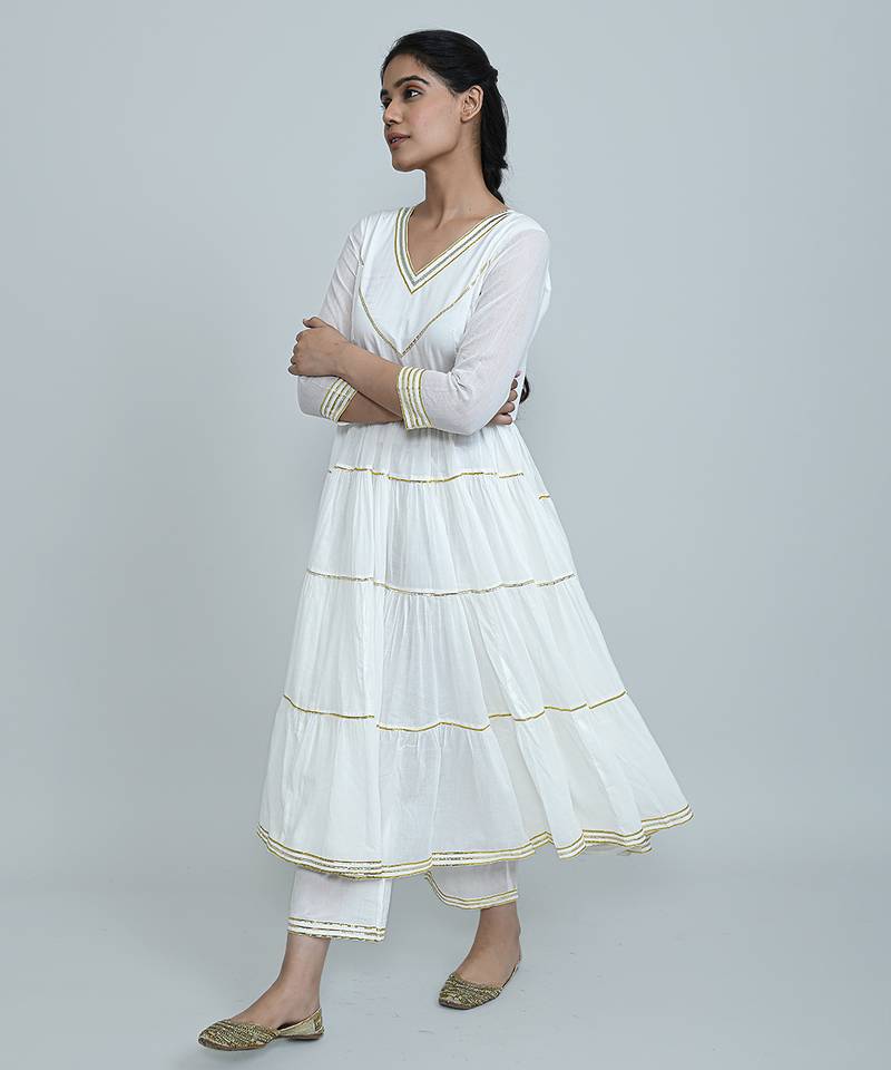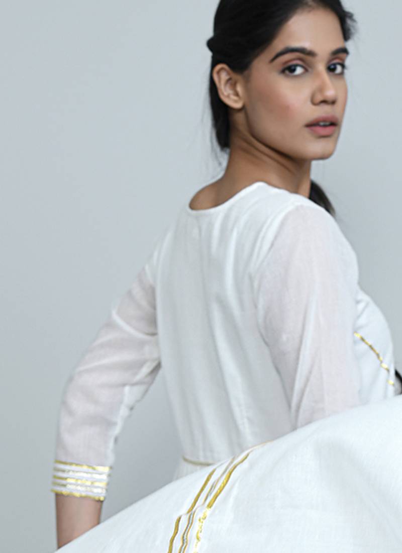 | Product Description | This Elegant White Kurta Set Is Crafted From Premium Mulmul, Offering Unmatched Softness And Breathability. Featuring A Tiered Silhouette With Intricate Gota Lace Detailing On The Neckline, Sleeves And Hem, It Comes Paired With Palazzo Pants For A Graceful Finish. Lightweight And Festive, Perfect For Day Functions And Intimate Celebrations. |