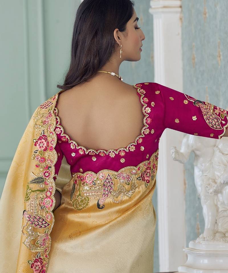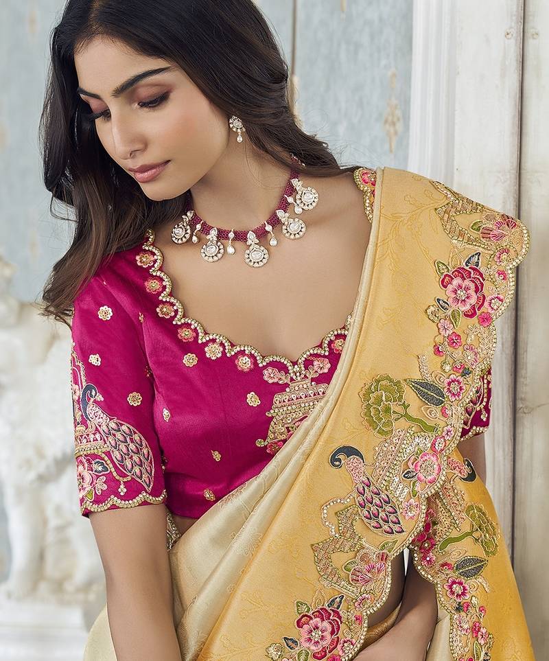 Yellow embroidered jacquard silk blend wedding saree with blouse fabric