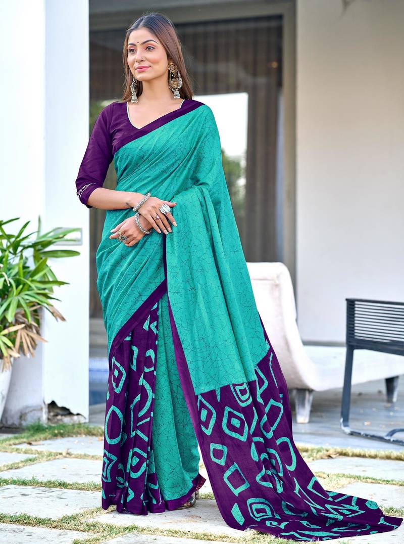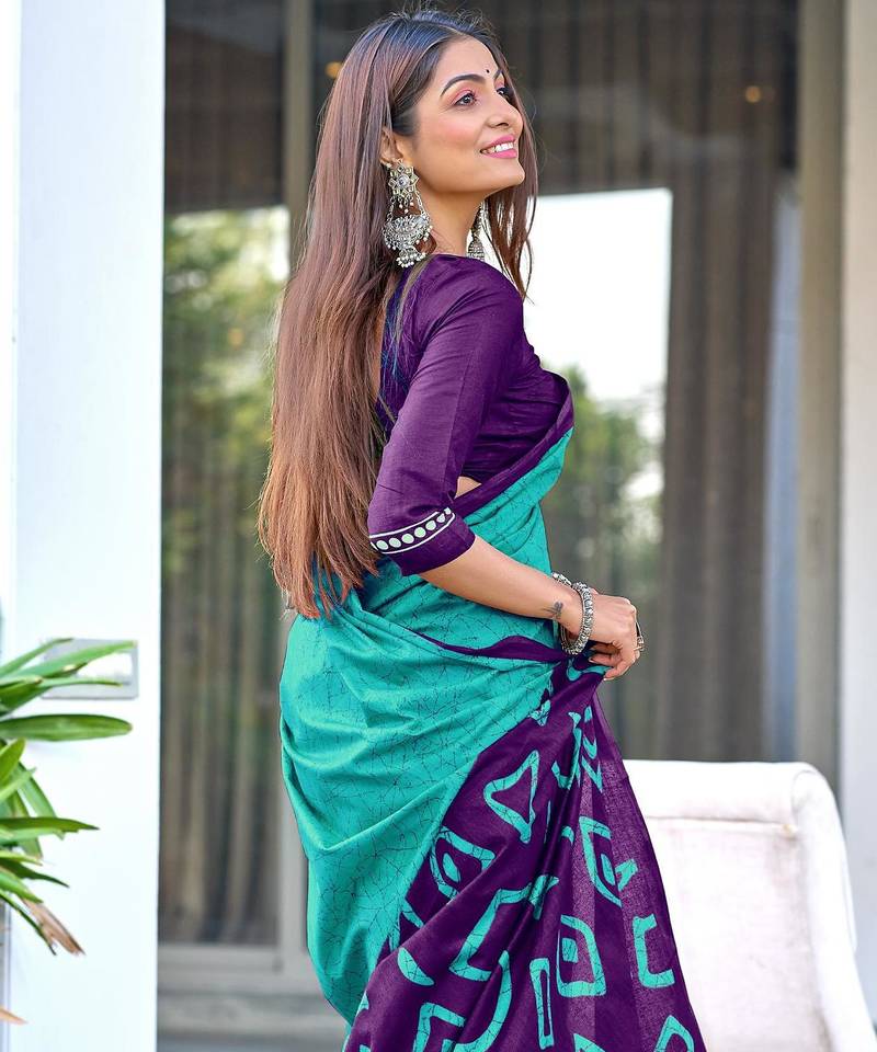 Product Description | Blue Soft Cotton Printed Fancy Saree With Blouse |